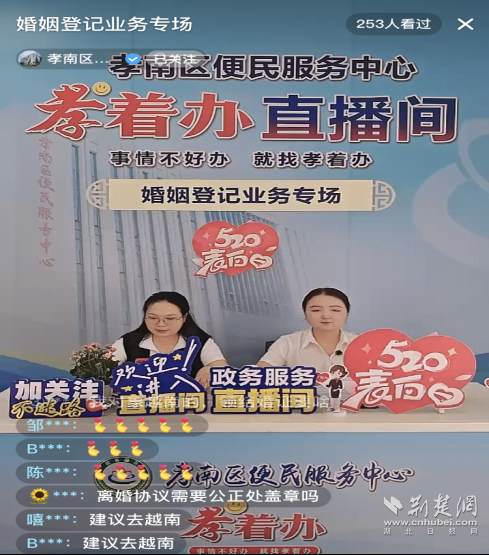 荊楚網(wǎng)(湖北日報網(wǎng))訊(通訊員 汪洋 程萌)“直播間的朋友們,大家下午好!今天是婚姻登記業(yè)務(wù)專場,我們會為大家講解婚姻的相關(guān)政策及業(yè)務(wù)辦理流程。大家普遍關(guān)心的婚姻熱點問題,都能在我們直播間里找到答案,歡迎大家在評論區(qū)與我們互動交流!”