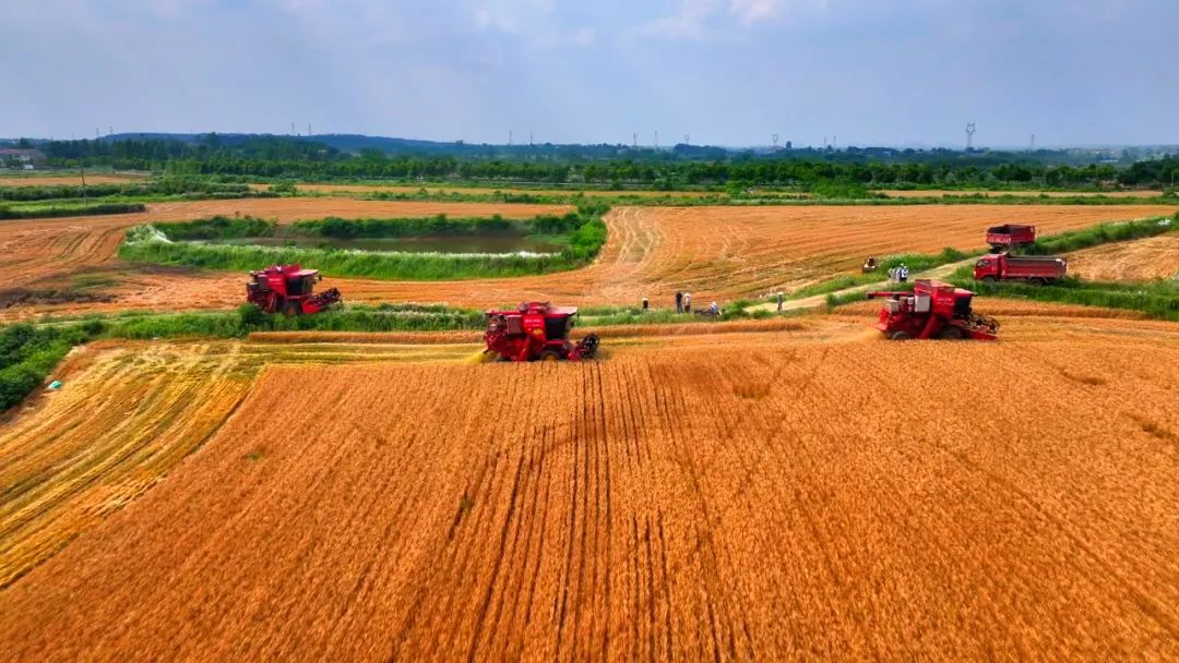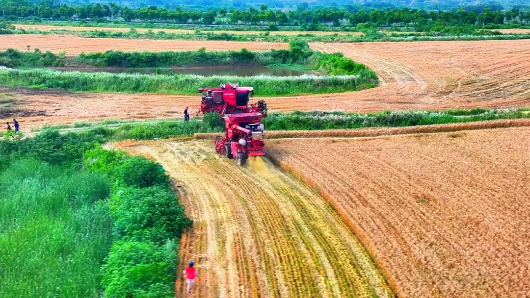 在鄒崗鎮(zhèn)周興村的麥田里,大型收割機轟鳴前行,一簇簇小麥被吃進“肚子”,收割、脫粒、除雜一氣呵成,金黃的麥粒隨著收割機的管道傾瀉而出。