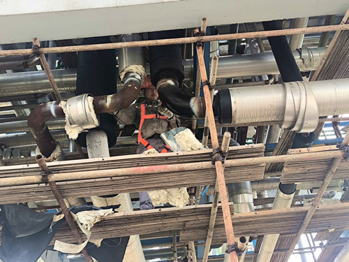 在此次檢驗任務接近尾聲時,一組檢驗人員發(fā)現(xiàn)有兩臺關鍵設備——閃蒸冷卻器的筒體上存在腐蝕減薄,并通過強度校核確認該設備目前的情況已不能安全運行到下個檢驗周期。對此,檢驗人員迅速書面告知企業(yè)相關負責人,并第一時間向當?shù)乇O(jiān)察部門匯報。為不影響企業(yè)開車復工的時間,檢驗人員在完成當天的檢驗工作后,連夜與使用單位設備負責人、維修單位商討維修方案,并積極與設計單位進行確認,最終在企業(yè)開車復工前兩小時順利完成維修監(jiān)檢確認?!笆菣z驗人員的付出與堅守,才能保障檢驗任務順利完成,保障了企業(yè)安全生產(chǎn)?!逼髽I(yè)相關負責人表示由衷的感謝。