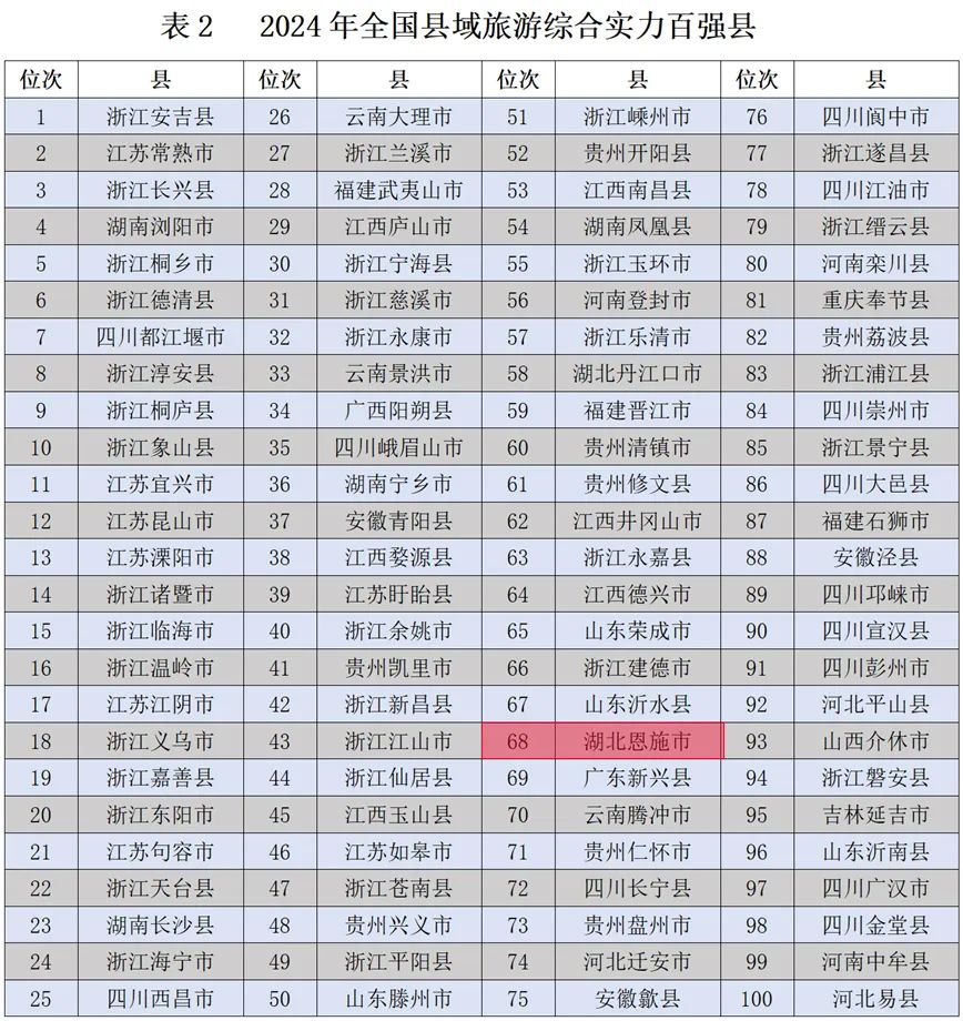 近日,由全國(guó)縣域旅游研究課題組、華夏佰強(qiáng)旅游咨詢(xún)中心近日在京聯(lián)合發(fā)布第六屆全國(guó)縣域旅游研究成果《全國(guó)縣域旅游發(fā)展研究報(bào)告2024》暨“2024年全國(guó)縣域旅游綜合實(shí)力百?gòu)?qiáng)縣”“2024年全國(guó)縣域旅游發(fā)展?jié)摿Π偌芽h”名單在京公布,恩施市上榜“2024年全國(guó)縣域旅游綜合實(shí)力百?gòu)?qiáng)縣”,自2019年來(lái),恩施市連續(xù)5年上榜。