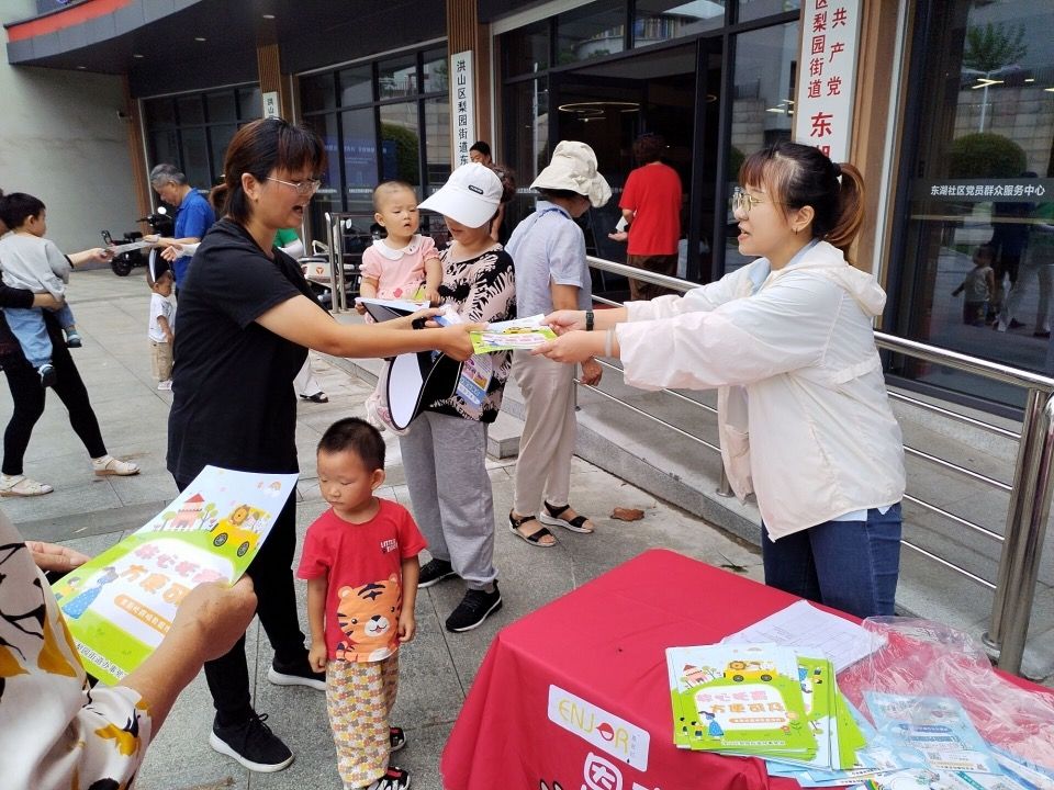 在東湖社區(qū)黨員群眾服務(wù)中心,工作人員通過設(shè)置展板、發(fā)放宣傳單和宣傳品的方式,熱情向來往居民宣傳托育服務(wù)相關(guān)政策、嬰幼兒養(yǎng)育照護知識、健康生活理念等,進一步加強居民的托育意識。