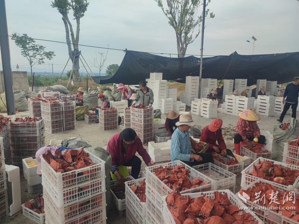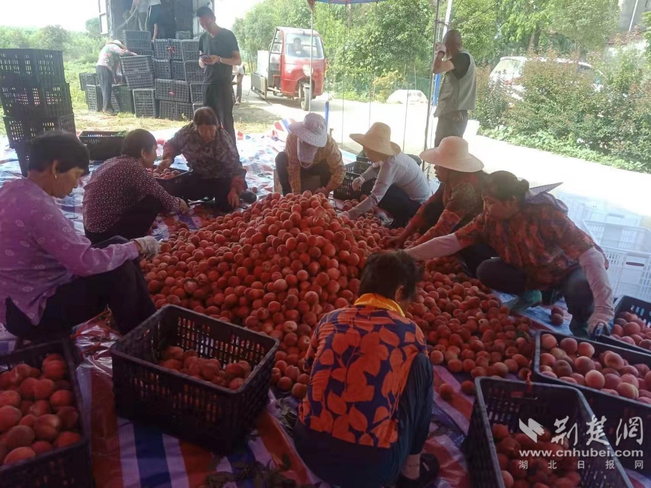 桃園內(nèi),桃農(nóng)們正忙著將清晨摘下的桃子進行稱重、裝箱。眼下,全國各地瓜果飄香。在楊店鎮(zhèn),萬畝桃園陸續(xù)成熟。清脆可口、香甜多汁的桃也成為當(dāng)?shù)氐奶厣止?,帶動農(nóng)戶增收。