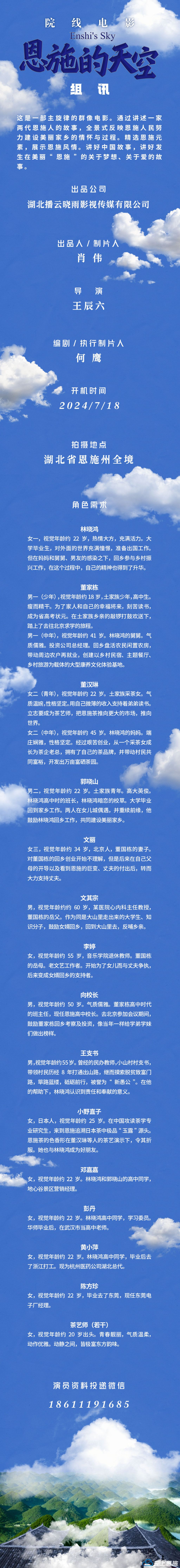 電影《恩施的天空》是一部主旋律的群像電影,通過精選恩施元素,展示恩施風情,電影講述了一家兩代恩施人的故事,全景式反映恩施人民努力建設美麗家鄉(xiāng)的情懷與過程。