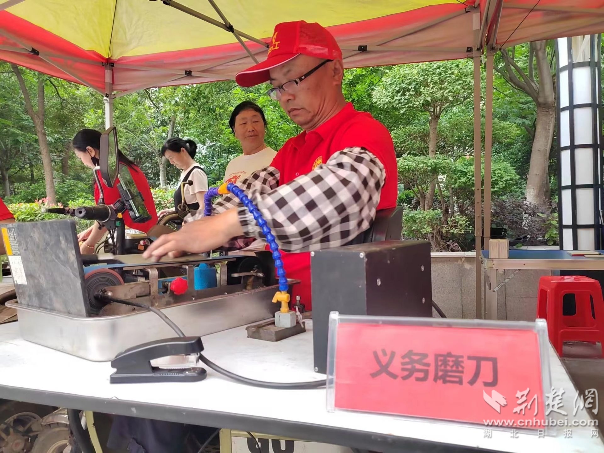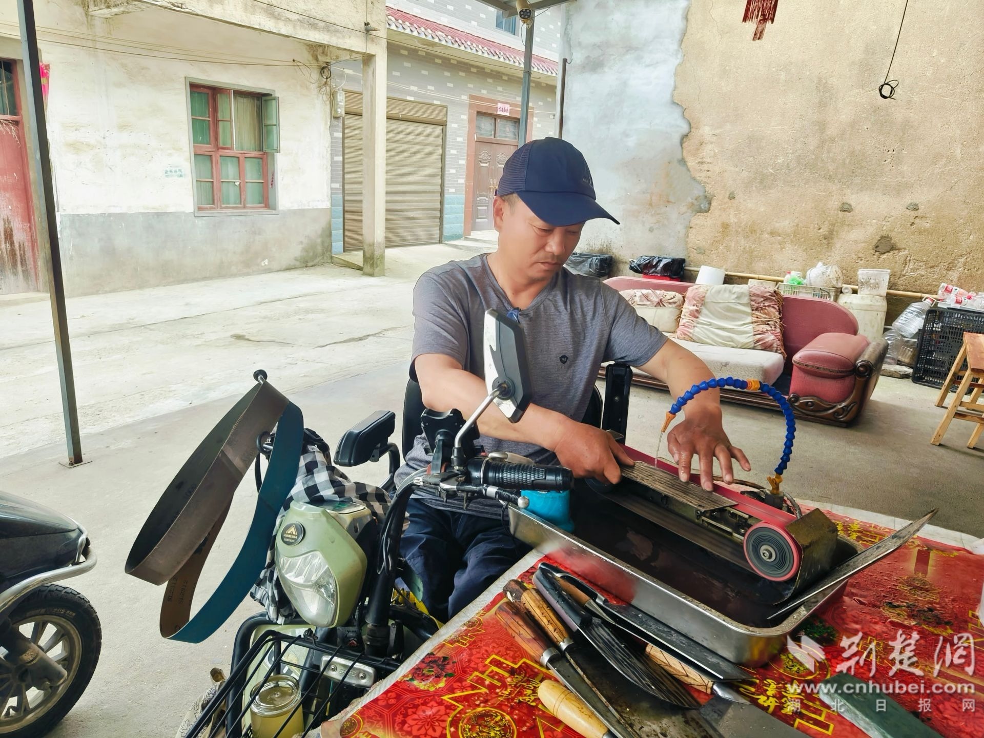 池漢橋在村民家中免費(fèi)磨菜刀。