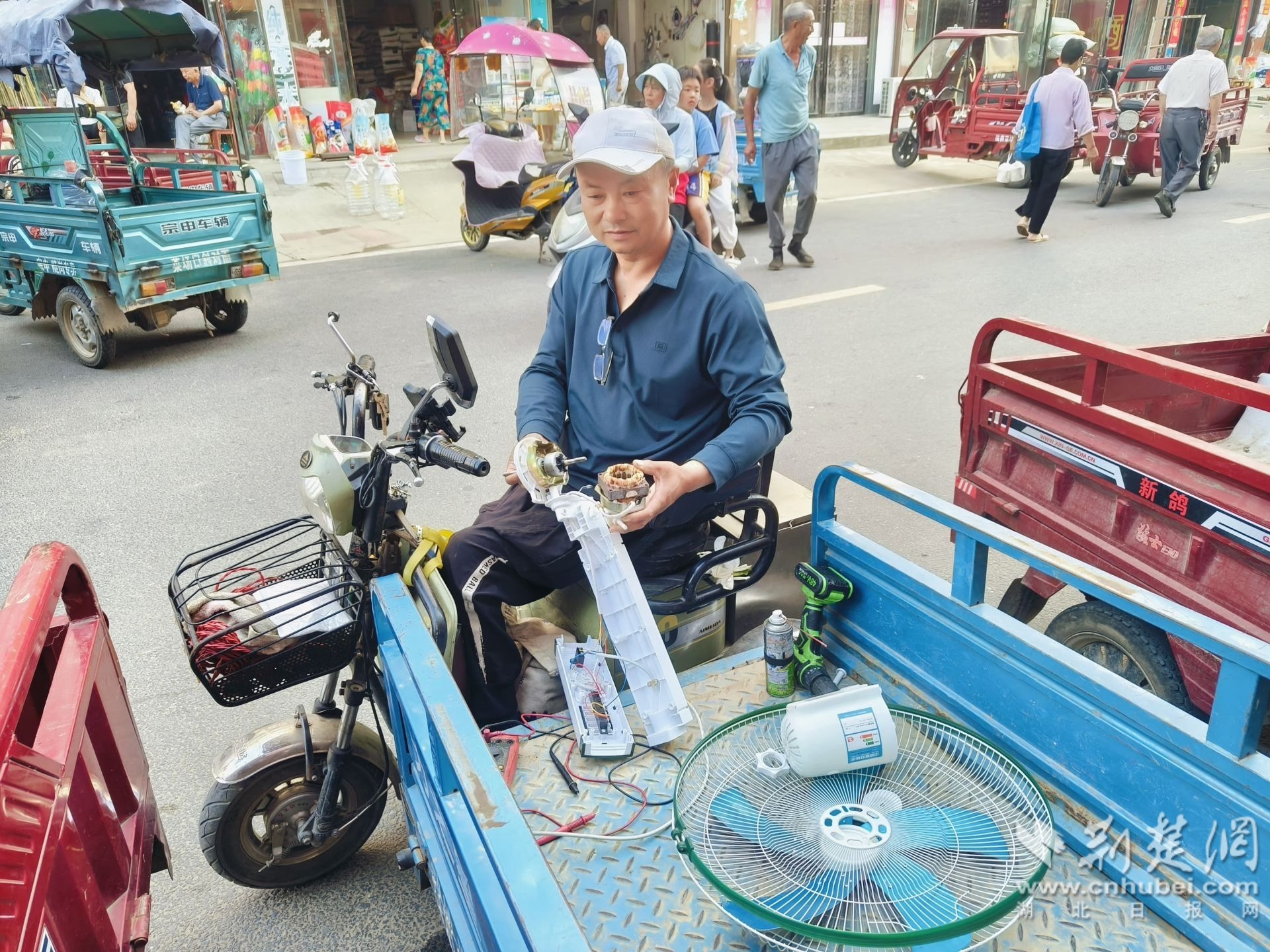 在孝南區(qū)陡崗鎮(zhèn)附近各村灣的鄉(xiāng)間小道上,總能看到一位騎著一輛電動(dòng)代步車的大叔,每天從日出到日落,數(shù)十年如一日,周而復(fù)始地前往老鄉(xiāng)家中幫忙修理電器。其樂(lè)觀、積極向上的精神狀態(tài),若不仔細(xì)觀察,不會(huì)發(fā)現(xiàn)他是一位高位截癱的殘疾人。