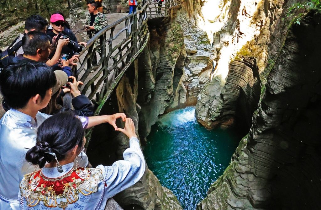 步入谷底,震撼所有感官。奇特的心形深潭,猶如大地跳動(dòng)的心臟,賦予了這片山谷浪漫而神秘的色彩;呼嘯而過(guò)的“地心崖漂”橡皮艇,留下游人的肆意吶喊與雀躍;奔騰的谷底河水卷起水汽彌漫,為夏日多添了份清涼與快意。來(lái)自陜西的游客趙女士表示,身心都沉浸在大自然的懷抱中,這趟探險(xiǎn)之旅令人倍感驚喜。