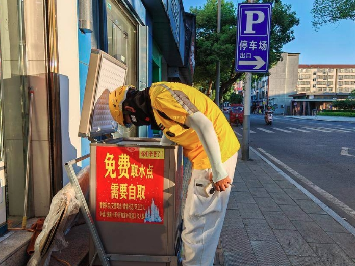 上午9點(diǎn)多,氣溫已升到30多度,忙碌了幾個(gè)小時(shí)的環(huán)衛(wèi)工人來(lái)到免費(fèi)取水點(diǎn),一口冰涼的礦泉水喝下去讓他們十分愜意,此時(shí)同樣來(lái)此處免費(fèi)取水點(diǎn)的還有一群外賣(mài)小哥。