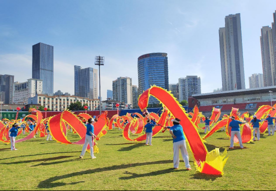 現(xiàn)場(chǎng)還有大氣蓬勃、翩翩起舞的88條彩帶龍;剛?cè)嵯酀?jì)、動(dòng)靜結(jié)合的傳統(tǒng)太極拳;場(chǎng)面震撼、整齊劃一的楚天健美走……豐富多彩的活動(dòng)打造全民參與的體育盛會(huì),展示著湖北群眾體育的蓬勃生命力!