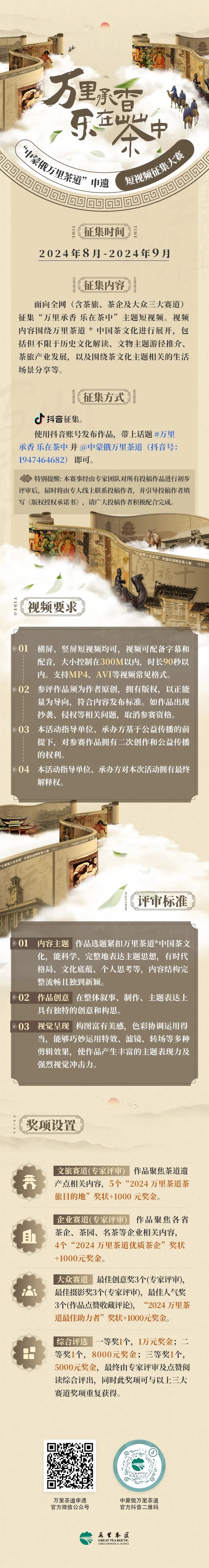 為弘揚(yáng)中華茶文化,講好萬(wàn)里茶道故事,“萬(wàn)里承香 樂在茶中”萬(wàn)里茶道抖音短視頻征集大賽,今起(8月11日)正式啟動(dòng)!