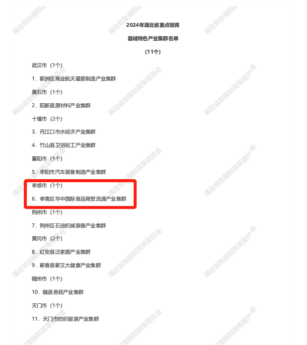 其中,孝南區(qū)紙衛(wèi)品產(chǎn)業(yè)集群、應(yīng)城市現(xiàn)代化工(井礦鹽化工)產(chǎn)業(yè)集群、漢川市紡織服裝產(chǎn)業(yè)集群、漢川市食品加工產(chǎn)業(yè)集群、安陸市銅箔及印制電路制造產(chǎn)業(yè)集群入選2024年湖北省縣域特色產(chǎn)業(yè)集群;孝南區(qū)華中國際食品商貿(mào)流通產(chǎn)業(yè)集群入選湖北省重點(diǎn)培育縣域特色產(chǎn)業(yè)集群名單。