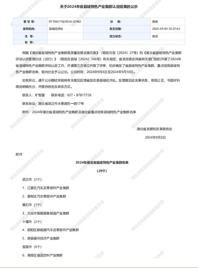荊楚網(wǎng)(湖北日報(bào)網(wǎng))訊(記者 楊卓玉)9月3日,湖北省發(fā)改委公布2024年省縣域特色產(chǎn)業(yè)集群認(rèn)定結(jié)果公示名單,孝感市6大產(chǎn)業(yè)集群入選。