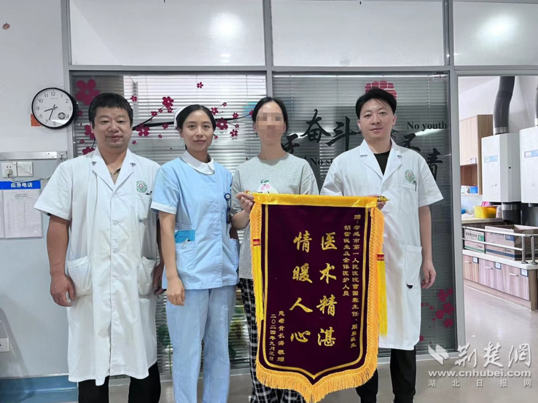 為了表達對醫(yī)護人員的感激之情,9月4日,在黃先生出院之際,他的妻子特地向醫(yī)院神經外科贈送了一面錦旗。