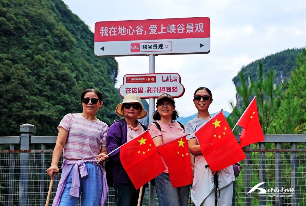 金秋時(shí)節(jié)的地心谷,青翠的松和五彩的落葉林交織相間,構(gòu)成五彩斑斕的畫卷。此刻,處處紅旗招展,游人可手拿國(guó)旗登山游覽、打卡留念,在金色的陽(yáng)光下愜意游玩,樂享假日時(shí)光。