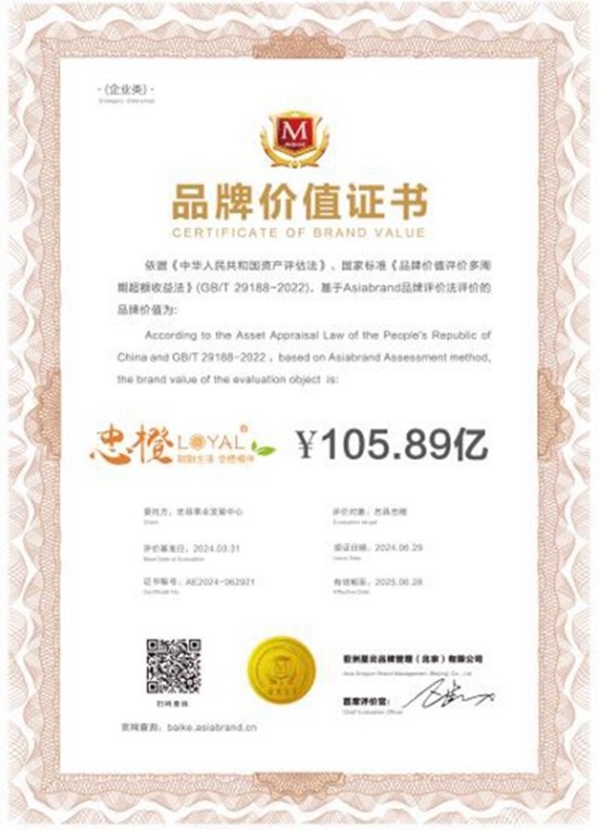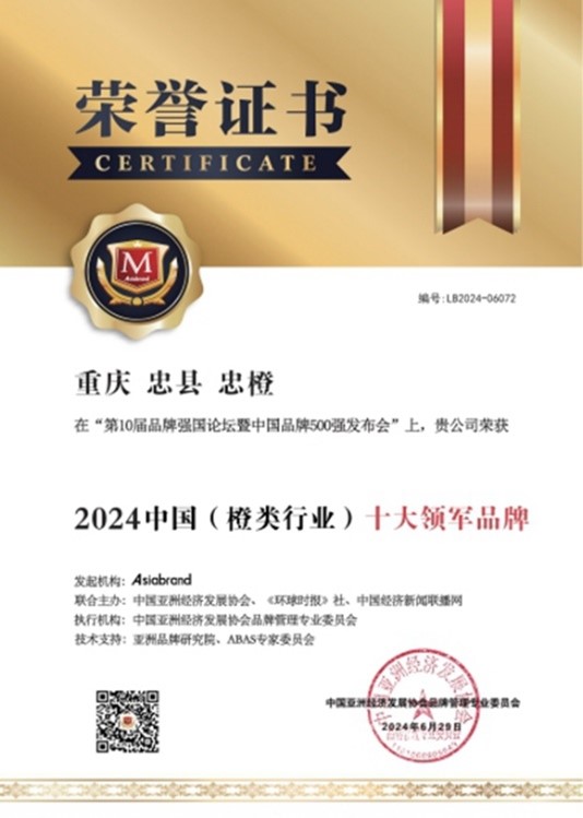 目前,“忠縣柑橘”已獲國(guó)家質(zhì)檢總局地理標(biāo)志保護(hù)認(rèn)證,今年6月,第10屆品牌強(qiáng)國(guó)論壇在北京舉行。會(huì)上,忠縣忠橙憑借卓越品質(zhì)與品牌影響力,獲得“2024中國(guó)品牌500強(qiáng)”“2024中國(guó)(橙類(lèi)行業(yè))十大領(lǐng)軍品牌”兩項(xiàng)榮譽(yù),其品牌價(jià)值躍升至105.89億元,標(biāo)志著忠縣忠橙品牌建設(shè)取得歷史性突破。