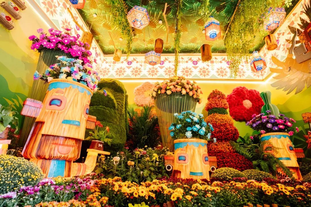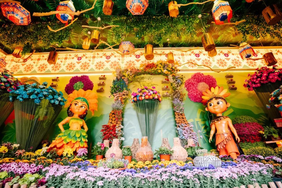 美洲館中異國菊花品種與南美洲文化的巨人石像、熱帶蜂鳥、巴西嘉年華IP、波利尼西亞人等元素相融合,展示了南美洲文化的獨特魅力,并通過菊花花展的形式向游客展示南美洲的藝術(shù)、美學(xué)和生活方式。