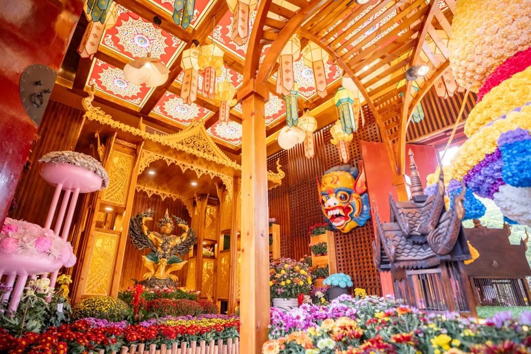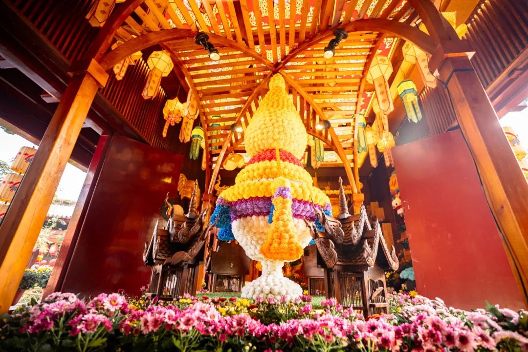東南亞館將泰國文化與菊花巧妙結(jié)合,打造出一場異國風(fēng)情的菊花景點,為游客帶來了解泰國文化和欣賞菊花美景的雙重體驗,主體部分用切花小菊扦插而成,布置各種色彩斑斕的菊花,結(jié)合泰國傳統(tǒng)花卉布置風(fēng)格,搭配泰國絲綢花布等裝飾,營造出濃郁的泰國風(fēng)味。