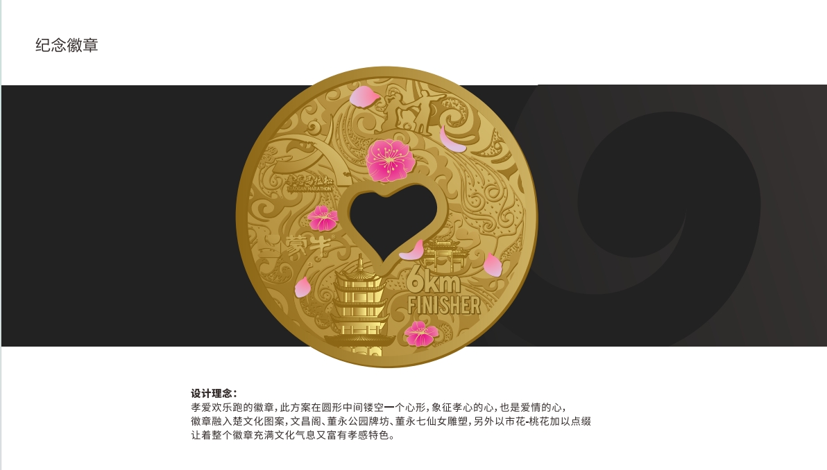 本次完賽獎牌和參賽服裝設計巧妙融合了楚文化圖案、文昌閣、董永七仙女雕塑、董永公園牌坊、浪漫桃花等孝感元素,凸顯“孝文化”主題。