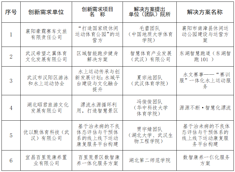 2024年6月12日,省體育局發(fā)布了《關(guān)于開展2024年湖北省體育產(chǎn)業(yè)創(chuàng)新創(chuàng)業(yè)大賽的公告》,在全省范圍內(nèi)征集體育產(chǎn)業(yè)創(chuàng)新需求和解決方案。10月29日,省體育局組織專家對參賽項目進(jìn)行了初賽評審,最終,推薦體育服務(wù)類、體育制造類各前六名進(jìn)入決賽路演。現(xiàn)將進(jìn)入決賽路演的項目名單進(jìn)行公示,公示期3天,公示時間為10月30日至11月1日。