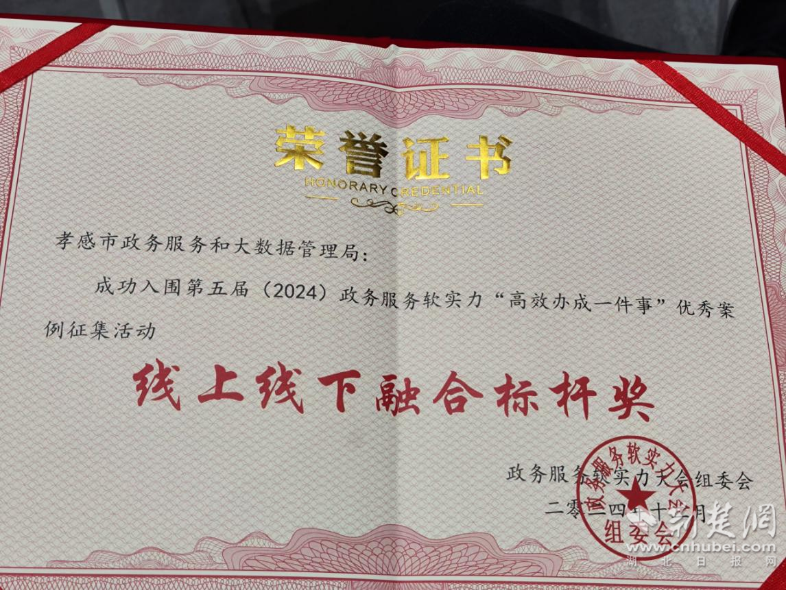 榮獲“線上線下融合標桿獎”是對孝感市推進政務服務改革、打造政務服務升級版的肯定。今后,孝感市政數(shù)局將創(chuàng)新推進辦一件事“只進一門、只找一人、一窗受理、一號訴求”的“四個一”模式,持續(xù)擦亮“孝著辦”營商環(huán)境品牌,為加快建成武漢都市圈重要節(jié)點城市貢獻力量。