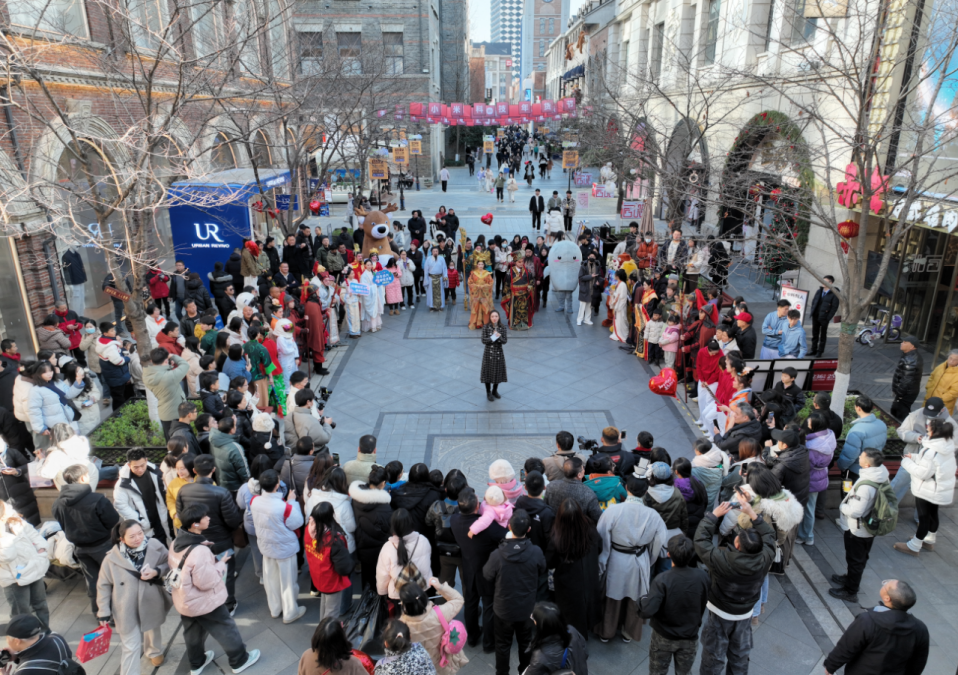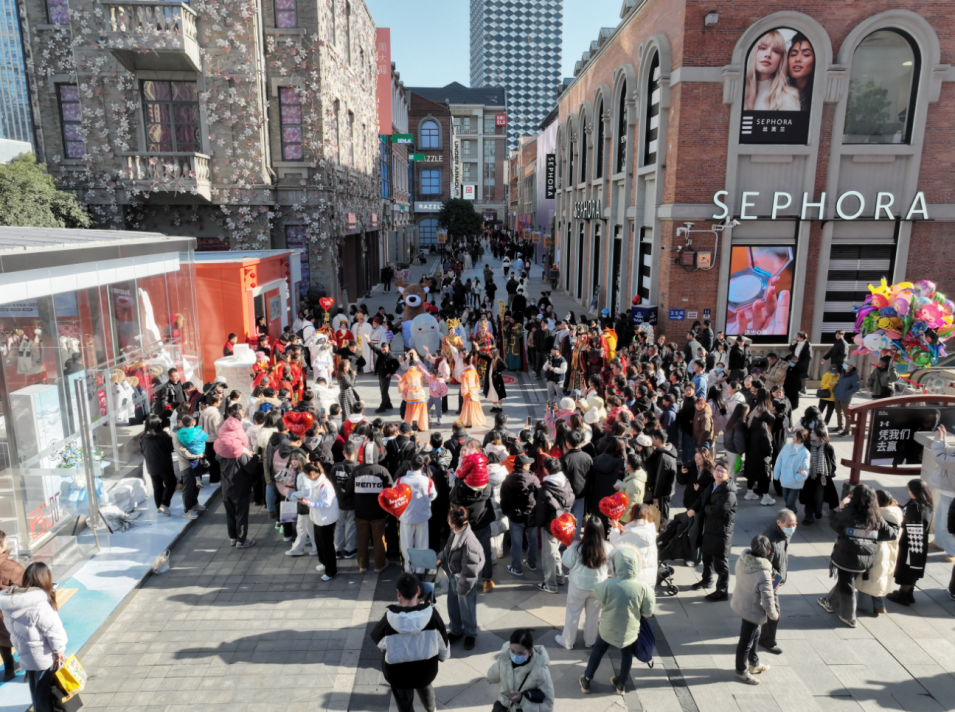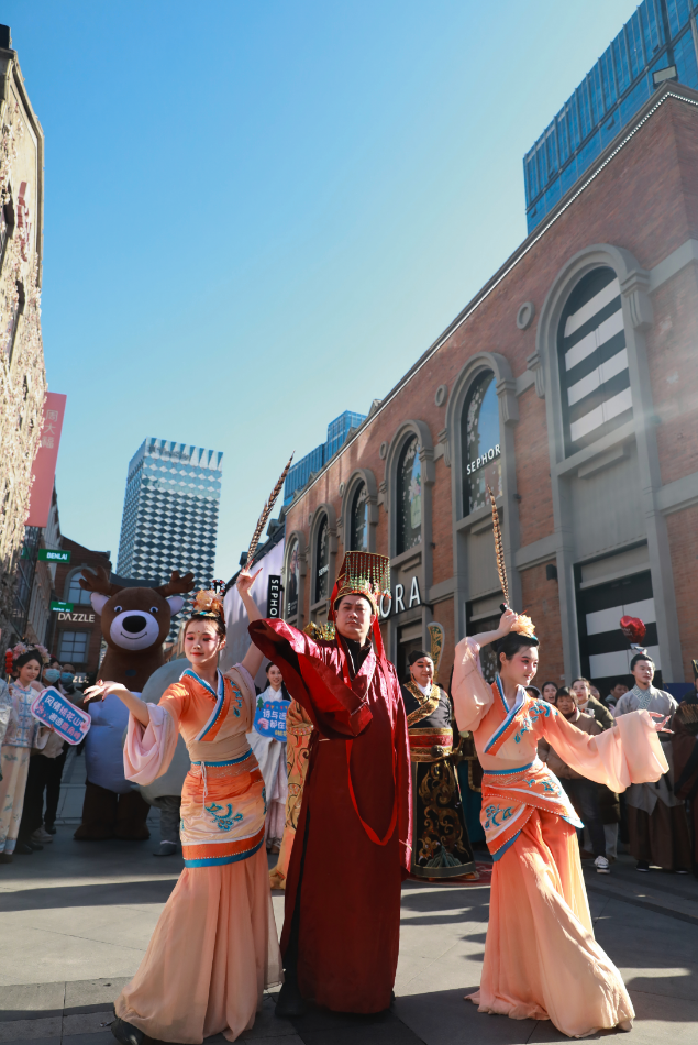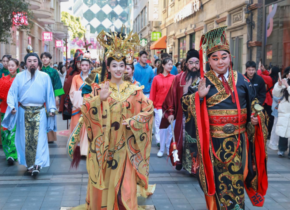 活動沿楚河漢街、屈原廣場和萬達廣場“一線兩區(qū)”同步展開。28日下午2點,在楚河漢街屈原廣場,極富荊州特色的古裝華服巡游開始,拉開了本次活動的序幕??∧忻琅畟兩碇厣棥⑷龂鳦OS服飾以及民俗特色服飾,組成巡游方陣,劉關張、楚王、屈原等歷史人物紛紛登場,瞬間點亮了整條楚河漢街商業(yè)區(qū),成為武漢最熱門的打卡點。