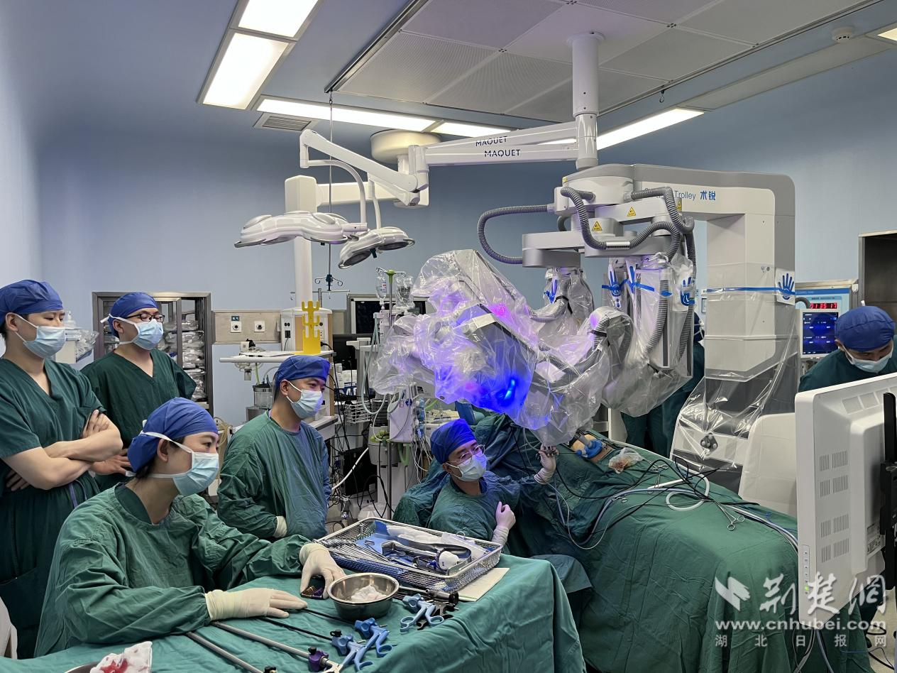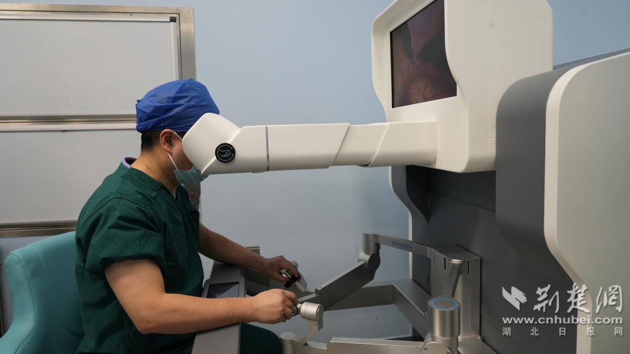 兩例手術(shù)均由孝感市中心醫(yī)院泌尿外科主任魏卓主刀,他在操控臺前通過觀看3D高清放大的視圖,眼看、手動、腳踩,發(fā)出一系列指令,精確地操縱著伸入患者體內(nèi)的四支蛇形機械臂,完成了一系列精細的操作,包括前進、后退、分離和電凝等動作。主治醫(yī)師范哲奇、住院醫(yī)師肖邦則在手術(shù)臺上根據(jù)手術(shù)需要適時更換器械。