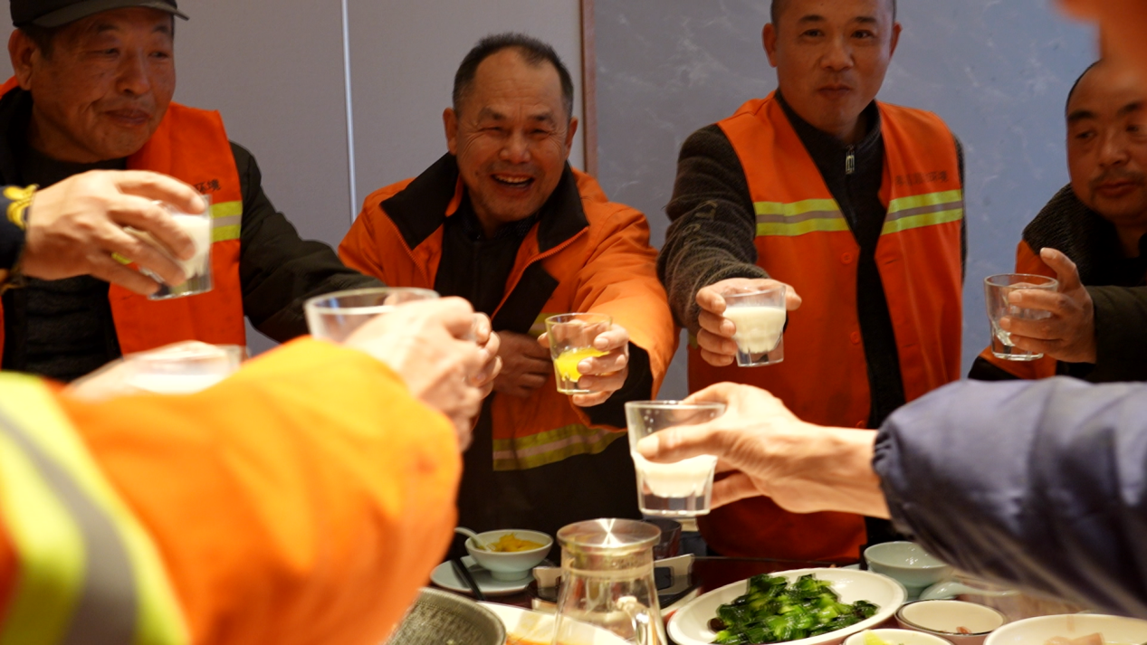 飯桌上,這場有說有笑的年飯,滿是人間煙火氣。樸實的環(huán)衛(wèi)工人們相互祝福、舉杯歡慶,你為我添飲料,我為你夾菜,溫馨的場景讓人動容。他們在享受這份溫暖的同時,也心懷感恩。