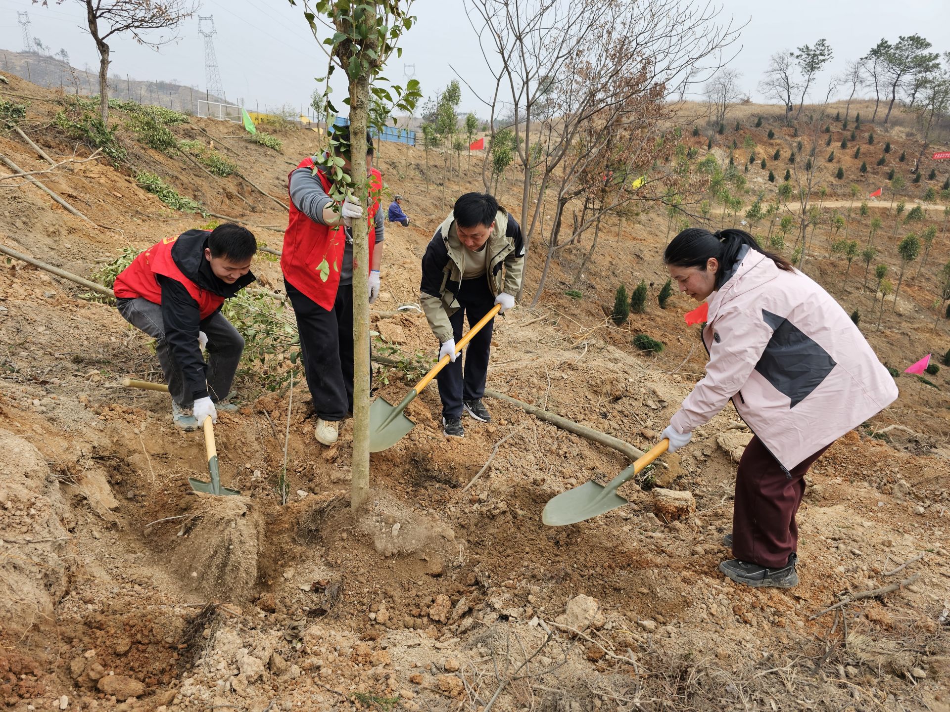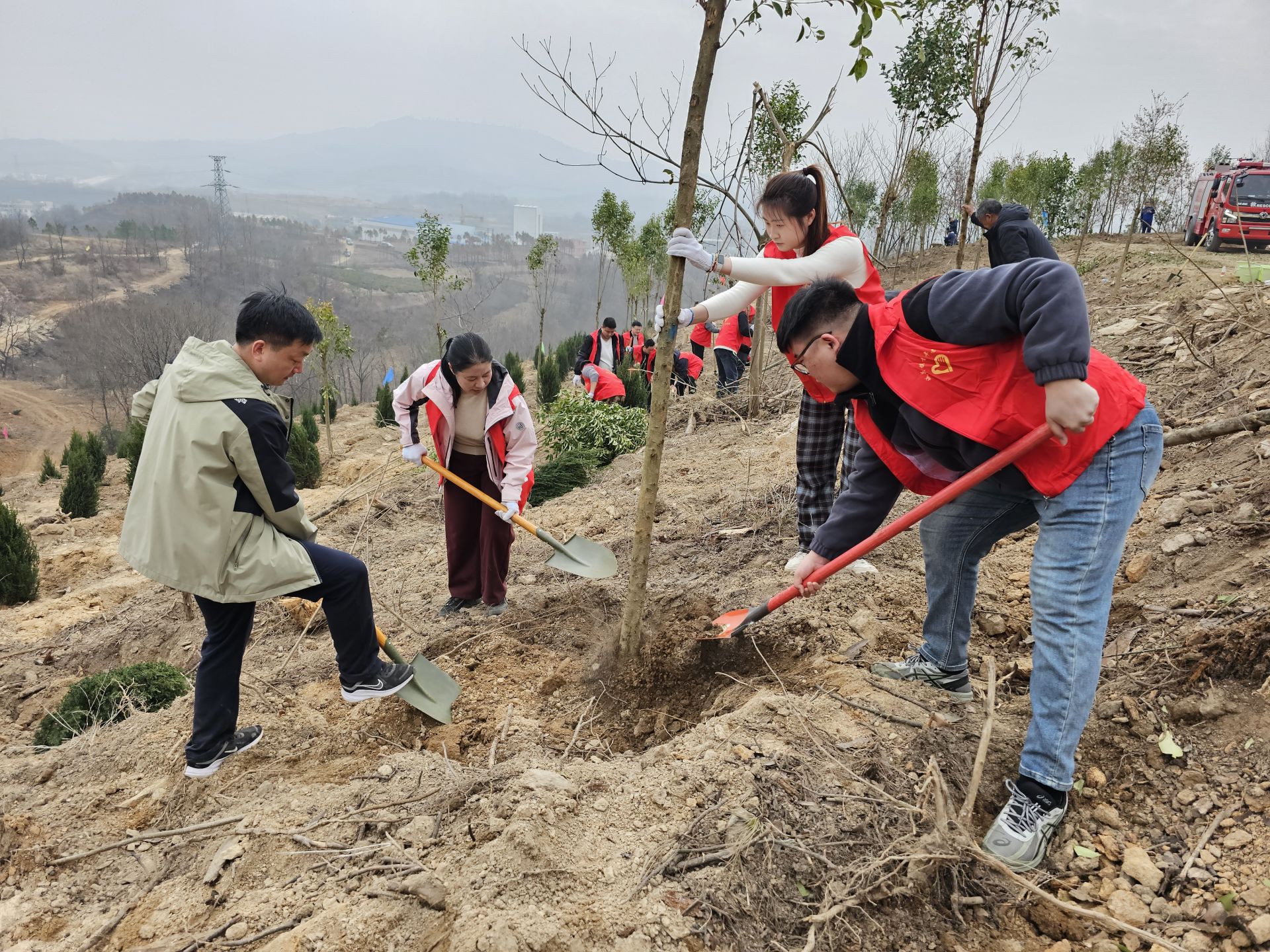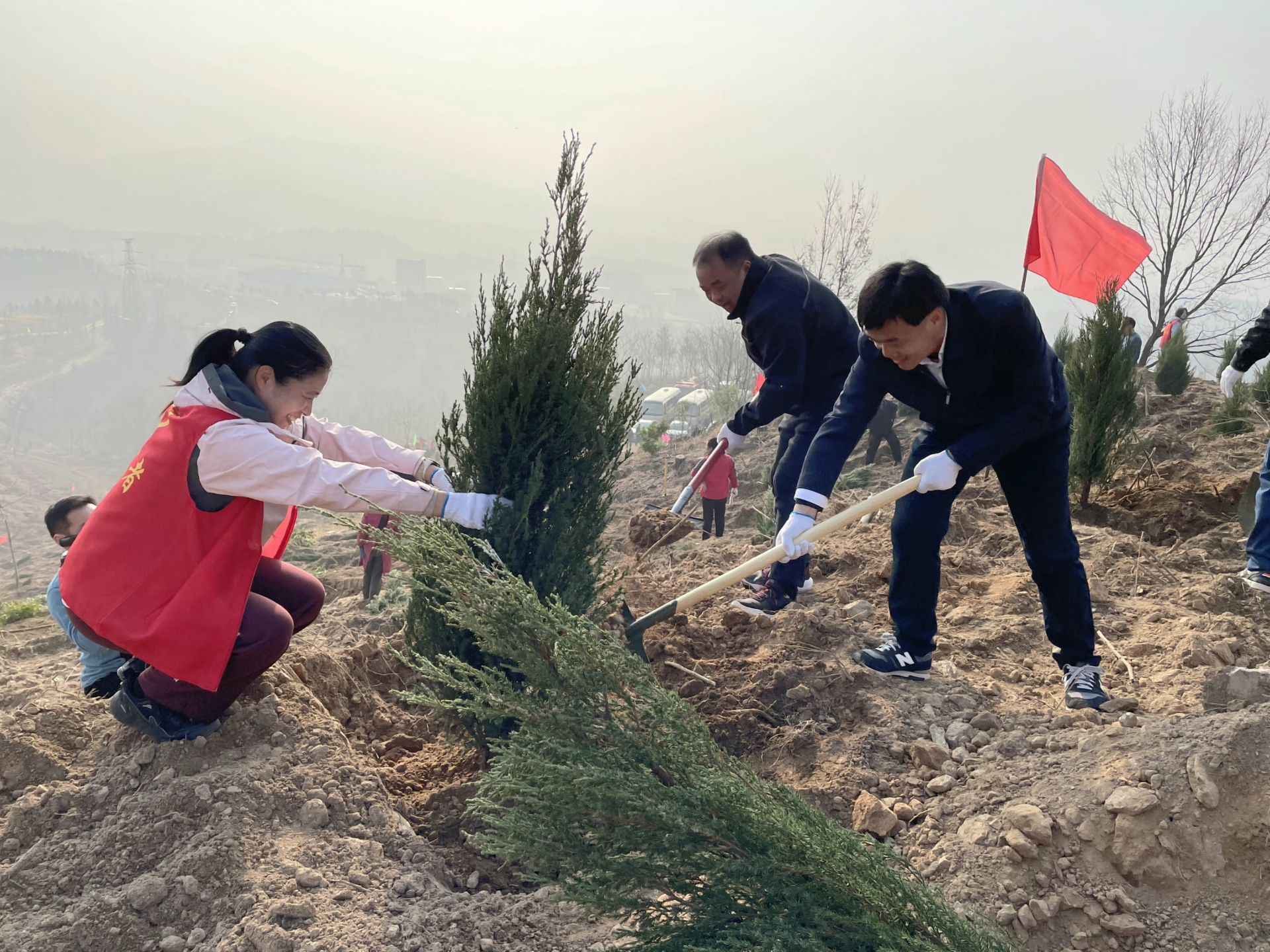 來自全縣各單位各部門的黨員干部和附近群眾組成的3000余名志愿者組成的植樹大軍,熱情高漲,干勁十足,揮鍬鏟土、扶苗填坑、培土澆水,每一個(gè)環(huán)節(jié)都一絲不茍,每一個(gè)步驟都井然有序。一株株新栽下的樹苗迎風(fēng)挺立,展現(xiàn)出勃勃生機(jī)。