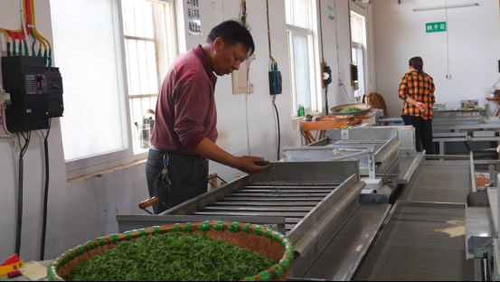 山上采茶忙碌,山下制茶飄香。在合作社的茶加工車間內(nèi),茶香四溢,一片熱火朝天。經(jīng)過攤青、揉捻、烘干等多道工序,一片片鮮葉搖身一變,成了色澤翠綠、香氣清幽的上好春茶。