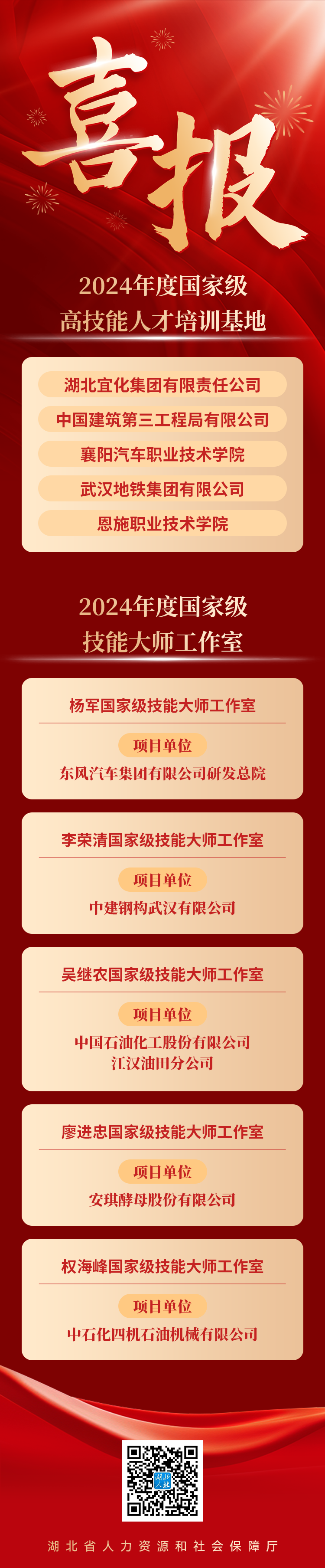近期,人力資源社會保障部辦公廳、財政部辦公廳公布2024年國家級高技能人才培訓(xùn)基地和技能大師工作室項目單位備案名單,湖北省5家國家級高技能人才培訓(xùn)基地、5家國家級技能大師工作室入選。