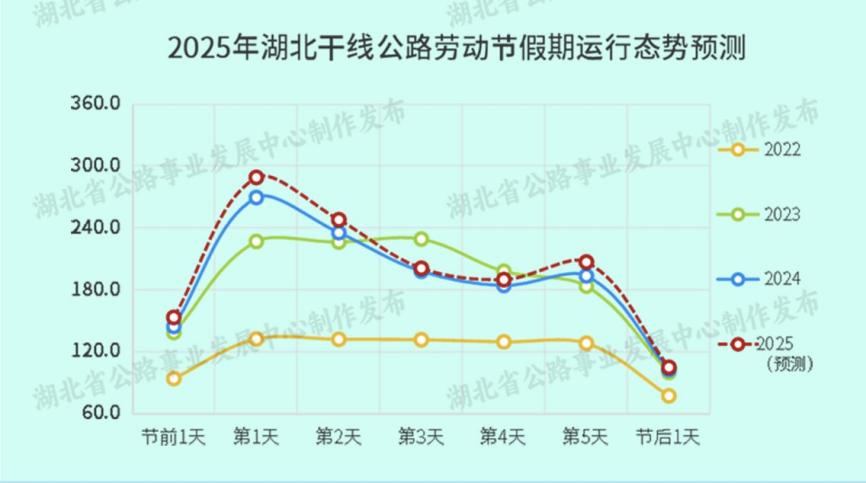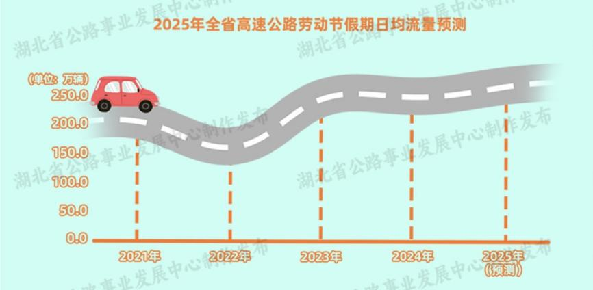 湖北省公路事業(yè)發(fā)展中心根據(jù)歷年路網(wǎng)運(yùn)行數(shù)據(jù)分析,結(jié)合假期全省路網(wǎng)天氣預(yù)測(cè)以及近期車流量等運(yùn)行實(shí)際,預(yù)計(jì)勞動(dòng)節(jié)假期期間高速路網(wǎng)通行車輛流量為近期平日日均流量的2.14倍,較2024年勞動(dòng)節(jié)假期日均流量同比增長(zhǎng)約5%。