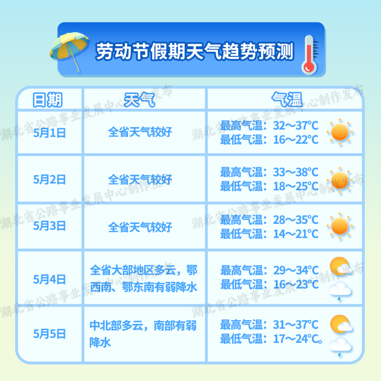 湖北省公路事業(yè)發(fā)展中心經(jīng)與省氣象服務(wù)中心會(huì)商研判,預(yù)計(jì)今年勞動(dòng)節(jié)小長(zhǎng)假期間(5月1日—5日),我省前晴后雨,氣溫變化平穩(wěn),溫度適宜,天氣條件總體利于出行。其中,5月1日—3日全省天氣較好;4日大部地區(qū)多云,鄂西南、鄂東南有弱降水;5日中北部多云,南部有弱降水。