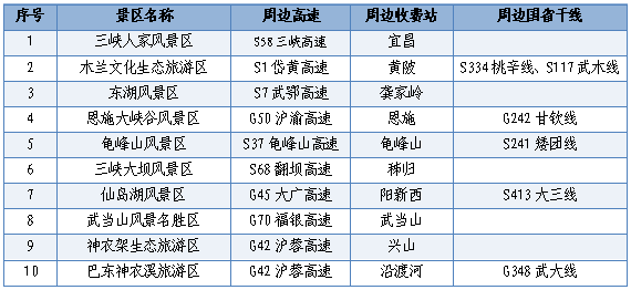 流量集中的高速公路收費(fèi)站主要有S15漢蔡高速琴臺(tái)站,S7武鄂高速龔家?guī)X站,S1岱黃高速府河站,S58三峽高速宜昌站,S17硚孝高速?gòu)胶诱?,G50滬渝高速黃石北站、潛江站,G55二廣高速荊州中站、襄陽(yáng)西站,G70 福銀高速十堰東站。