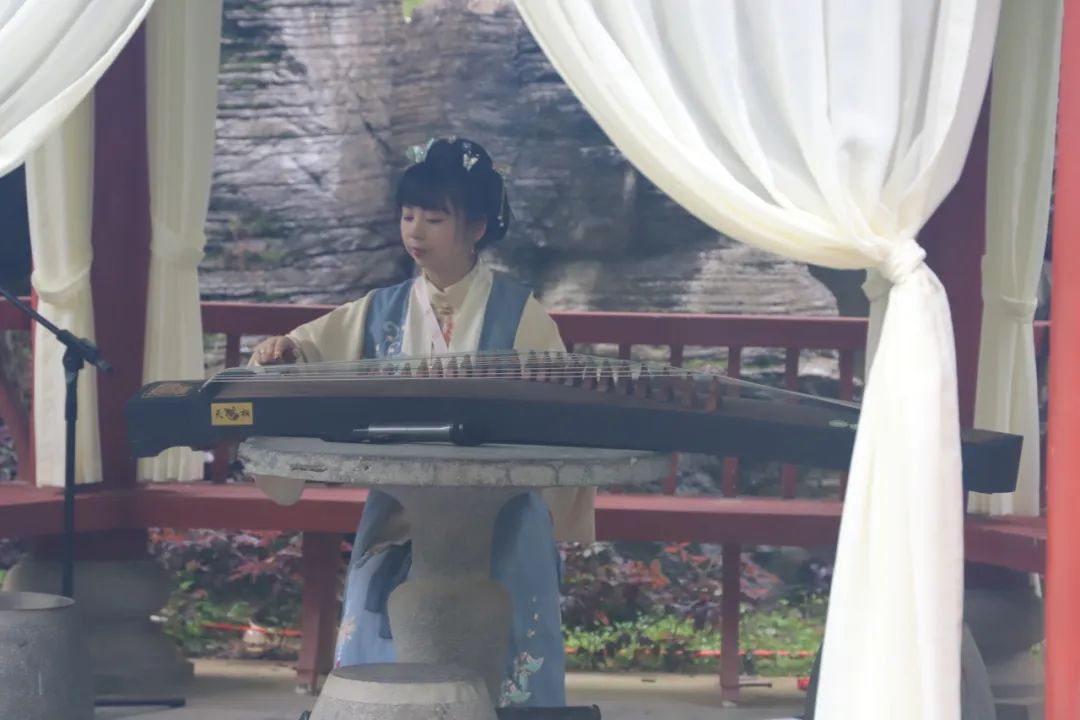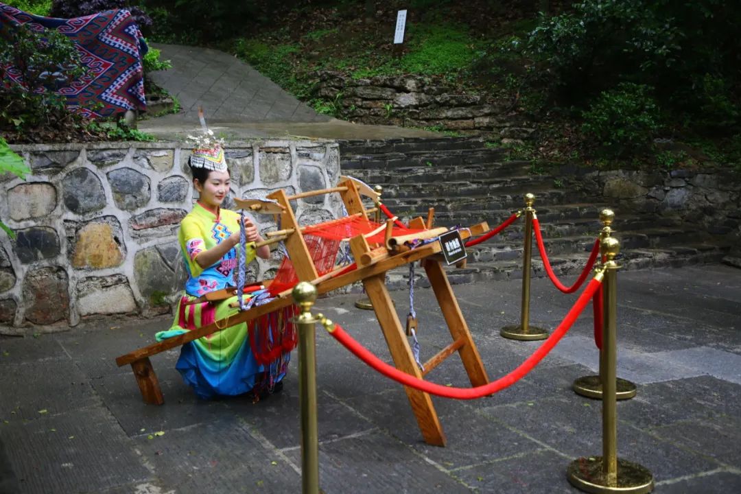 曲徑通幽的花園內(nèi)設(shè)有三個(gè)常態(tài)表演點(diǎn),游客可以在石泉溪流旁近距離觀看土家織錦的技藝,在群芳亭下欣賞古色古香的錚錚琴音,往前行進(jìn)可以參與互動(dòng)土家婚俗表演拋繡球,沉浸式感受特色土苗文化。