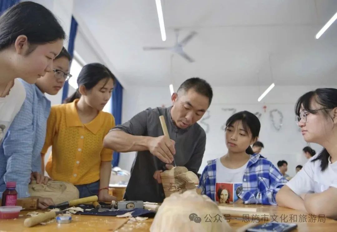 深化傳承人培養(yǎng),建立校地協同培養(yǎng)機制。支持、鼓勵非遺代表性傳承人先后在恩施職院、六角亭街道逸夫小學、芭蕉侗族鄉(xiāng)民族初中、崔壩鎮(zhèn)小學等20余所學校開展“恩施玉露制作技藝”“恩施板凳龍”“剪紙”“竹編”等非遺項目進校園工作。