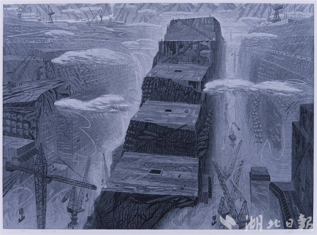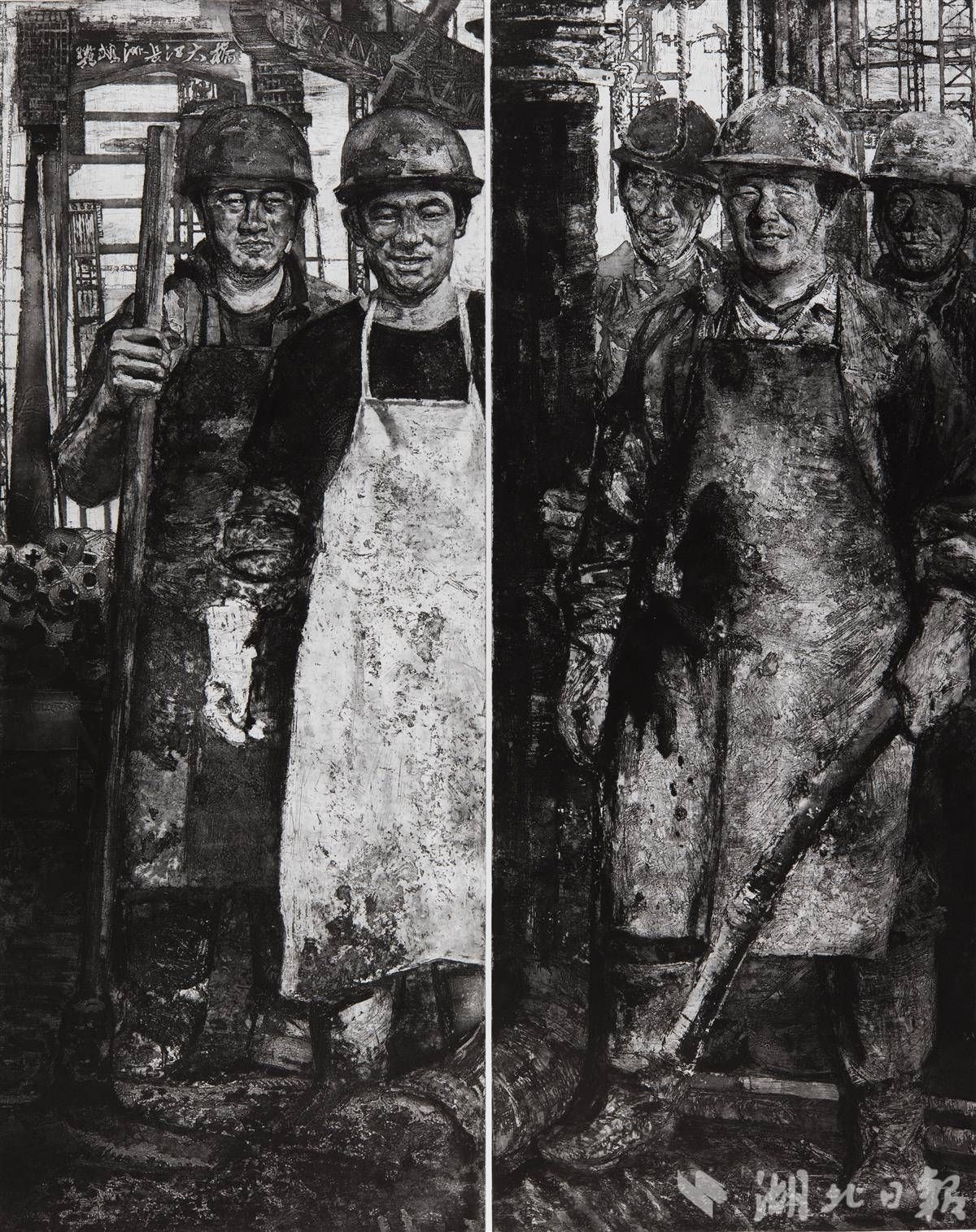 曹丹《陽光下的大橋澆筑工》銅版