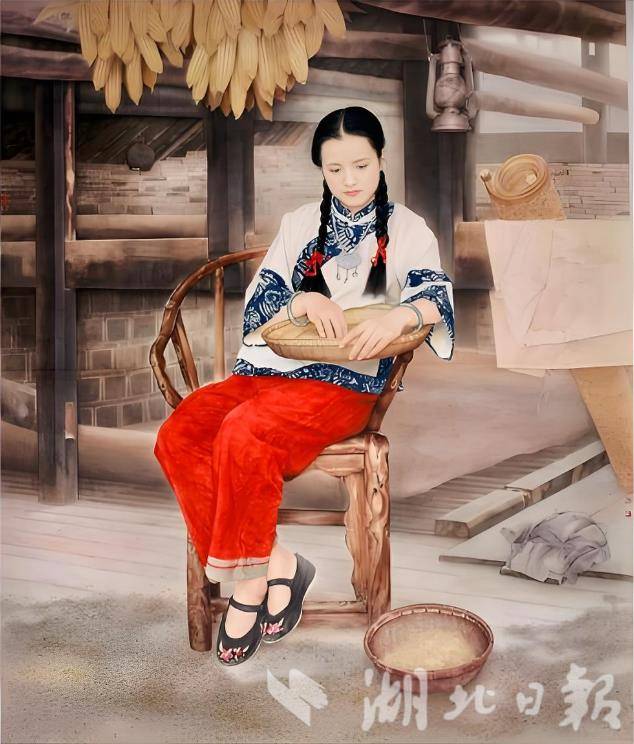 步入展廳,一幅幅美術(shù)史上的經(jīng)典作品及其描繪的美麗荊楚撲面而來。其中,湖北美術(shù)界前輩唐一禾創(chuàng)作的《江津?qū)懮弧访枥L了江津德感壩五十三梯的自然風光,以細膩的筆觸勾勒出梯田如織、遠山如黛的景象,層次分明、渾然天成。湯文選創(chuàng)作的《婆媳上冬學》表現(xiàn)婆媳二人在一個風雪交加的傍晚相互攙扶趕去學文化的場景。李乃蔚《銀鎖》是深入鄂西農(nóng)村生活創(chuàng)作的佳作,描繪佩戴銀鎖的土家族少女形象,將中國畫寫實技巧推向新高度。此外,王曉愚作品《世紀三峽》、曹丹作品《陽光下的大橋澆筑工》等全國美展大獎作品也集中展示。