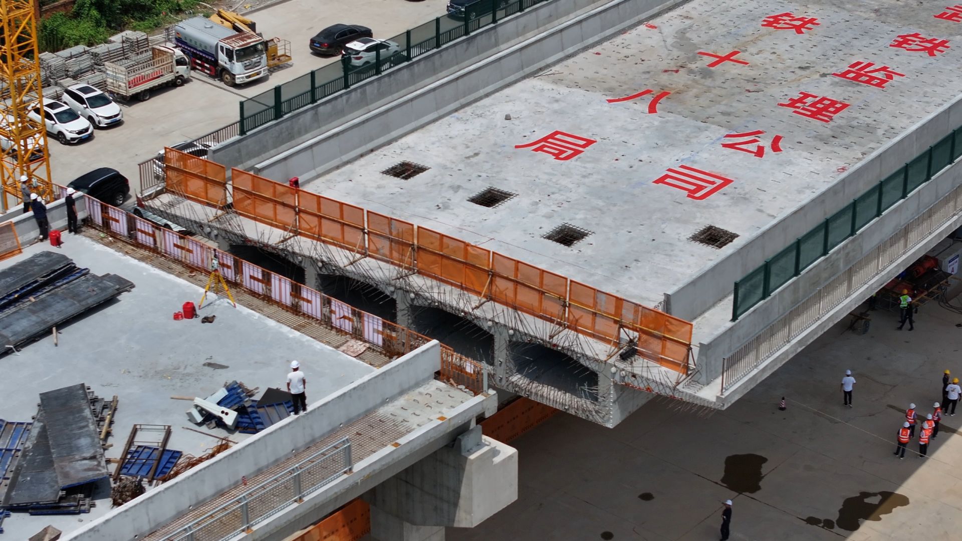 在孝昌華陽大道與京廣鐵路交叉工程HYSG標段主橋施工現(xiàn)場,只見一片大型橋梁“擱”在墩柱上,與10多米遠的京廣鐵路幾乎平行。墩柱下方有一個直徑約7米的轉盤,布滿鋼絞線,在連續(xù)千斤頂?shù)摹白Ю毕拢従徱苿恿后w。京廣鐵路孝昌段十分繁忙,每天有100多趟次列車通行。因此,建設者先在鐵路旁邊空地上建成橋體,再進行轉體施工,減少對鐵路運營的影響。