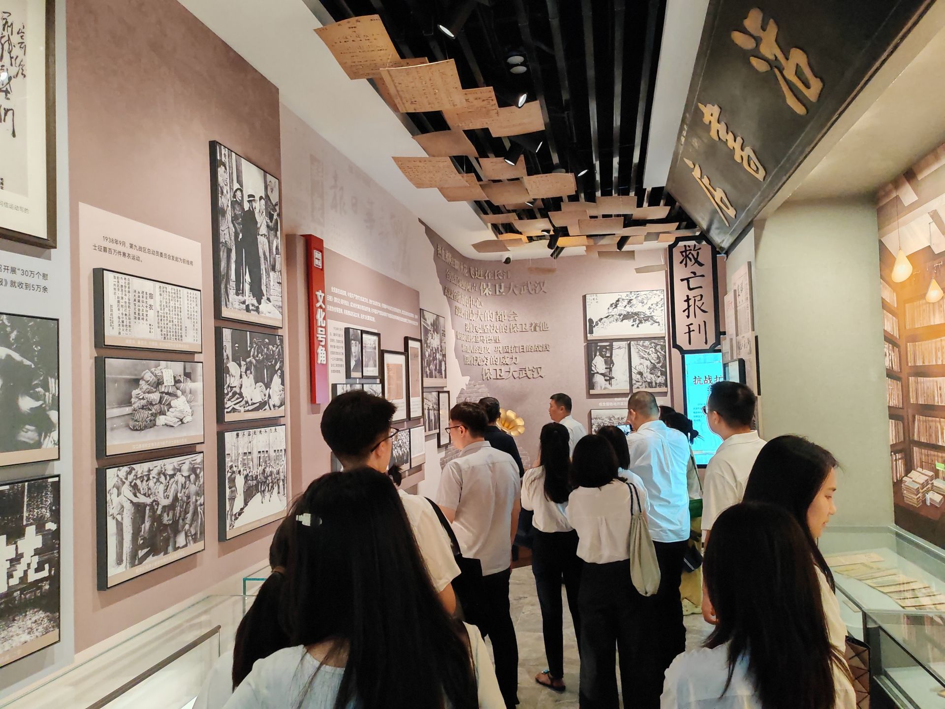“生活書店” 場景則以漢口分店為原型,復(fù)刻藍(lán)底白字的 “交通路63號” 門牌與1938年初版《魯迅全集》書脊,展柜內(nèi)的抗戰(zhàn)書籍搭配互動抽拉裝置、多媒體查詢屏,方便觀眾查閱當(dāng)年武漢發(fā)行的報刊雜志細(xì)節(jié)。展覽尾廳的 “V 字勝利墻”,匯集1945年各國報刊關(guān)于日本投降的新聞標(biāo)題與多語言 “日本投降” 字樣,成為觀眾打卡留念、感悟勝利意義的熱門點(diǎn)位。