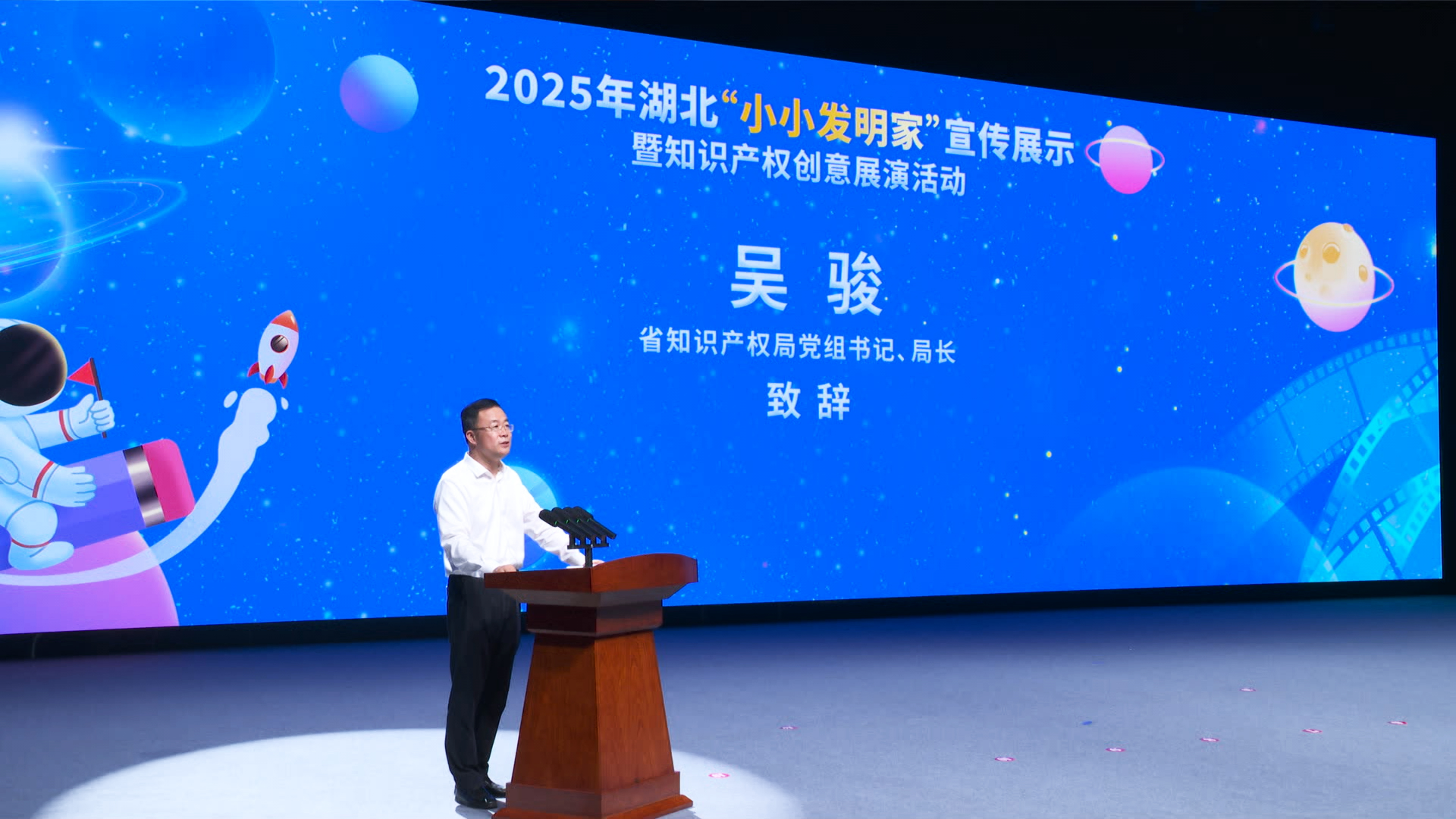 活動(dòng)在武漢市光谷第二十一小學(xué)樂(lè)隊(duì)和機(jī)器人共同帶來(lái)的開(kāi)場(chǎng)秀《閃耀明天》中拉開(kāi)帷幕。湖北省知識(shí)產(chǎn)權(quán)局黨組書(shū)記、局長(zhǎng)吳駿致辭表示,此次活動(dòng)旨在為全省熱愛(ài)科學(xué)、勇于創(chuàng)新的青少年們搭建一個(gè)激發(fā)靈感、展示才華、交流互鑒的廣闊平臺(tái),讓創(chuàng)新的種子在幼小的心靈中生根發(fā)芽,讓知識(shí)產(chǎn)權(quán)的理念在青春的土壤里茁壯成長(zhǎng)。他親切寄語(yǔ)“小小發(fā)明家”,永葆好奇之心,敢于提問(wèn),善于思考,勤于動(dòng)手,將天馬行空的想象變成創(chuàng)新創(chuàng)造的作品;初識(shí)知識(shí)產(chǎn)權(quán),了解它、尊重它、運(yùn)用它,學(xué)會(huì)保護(hù)創(chuàng)意,尊重發(fā)明創(chuàng)造;同時(shí)志存高遠(yuǎn),將今天的興趣發(fā)展成為明天的志向,努力成長(zhǎng)為科技自立自強(qiáng)的棟梁之材。