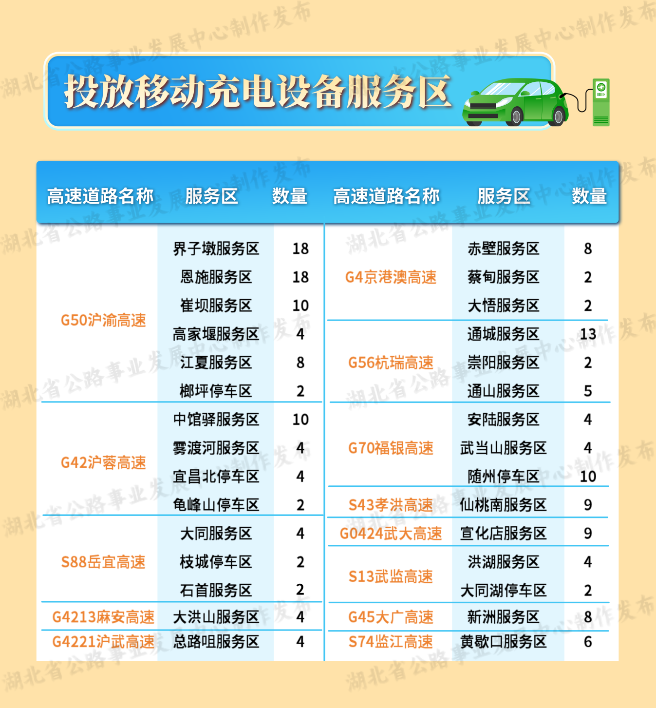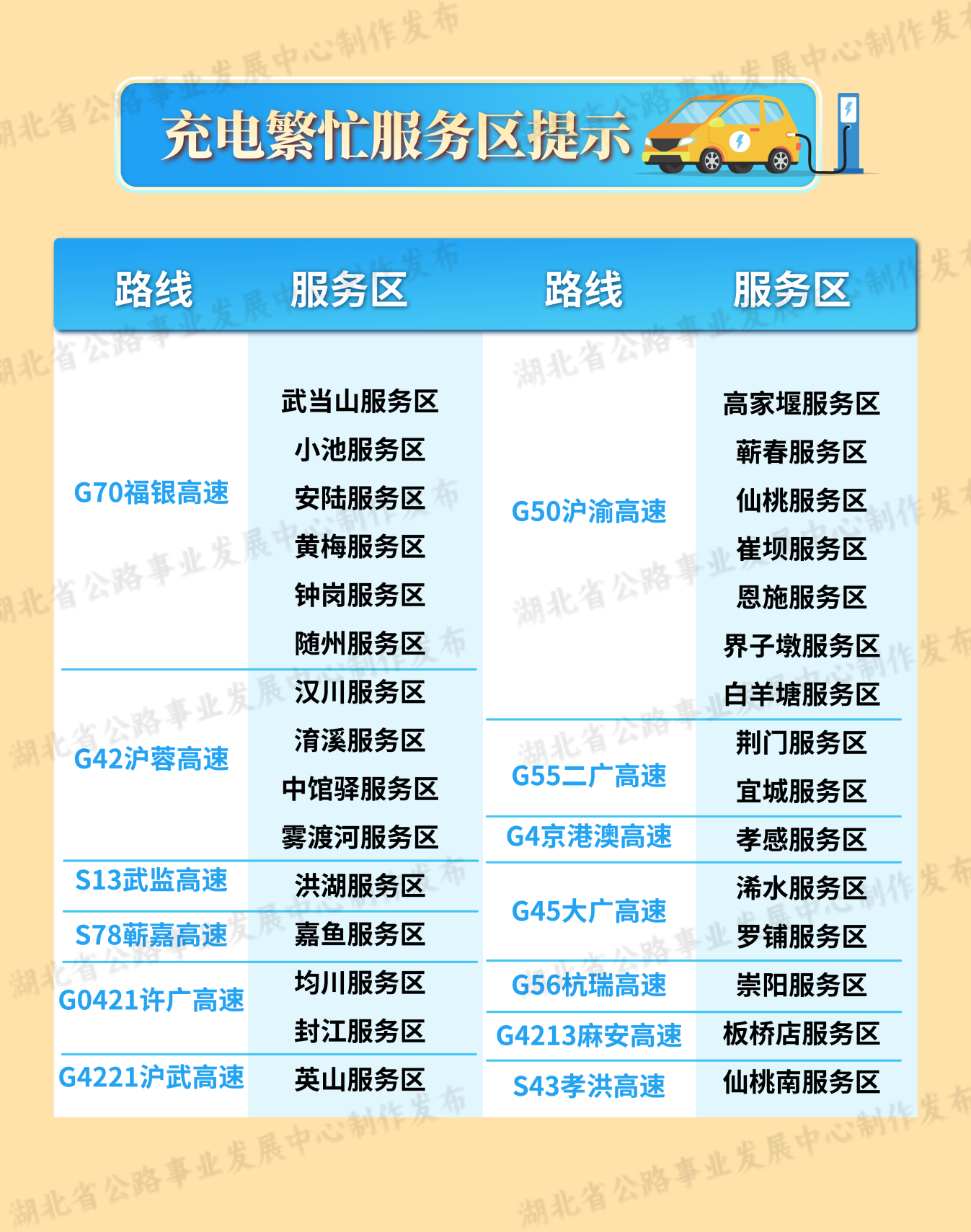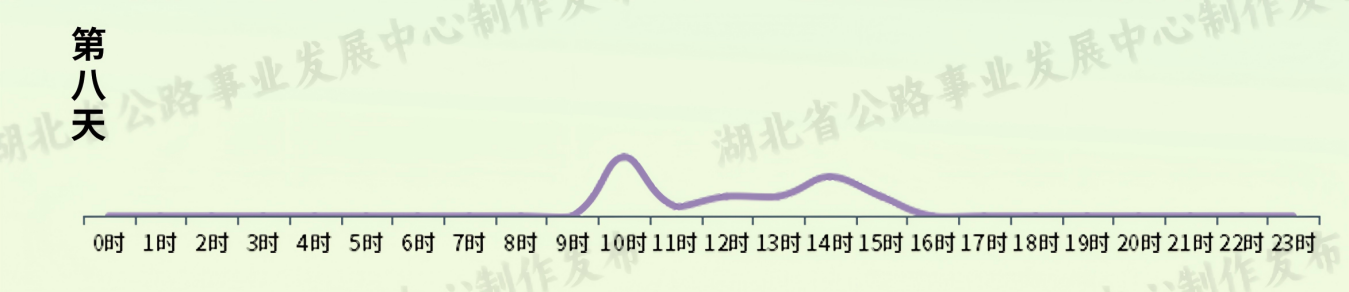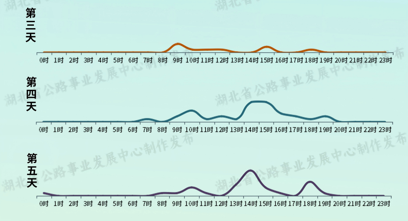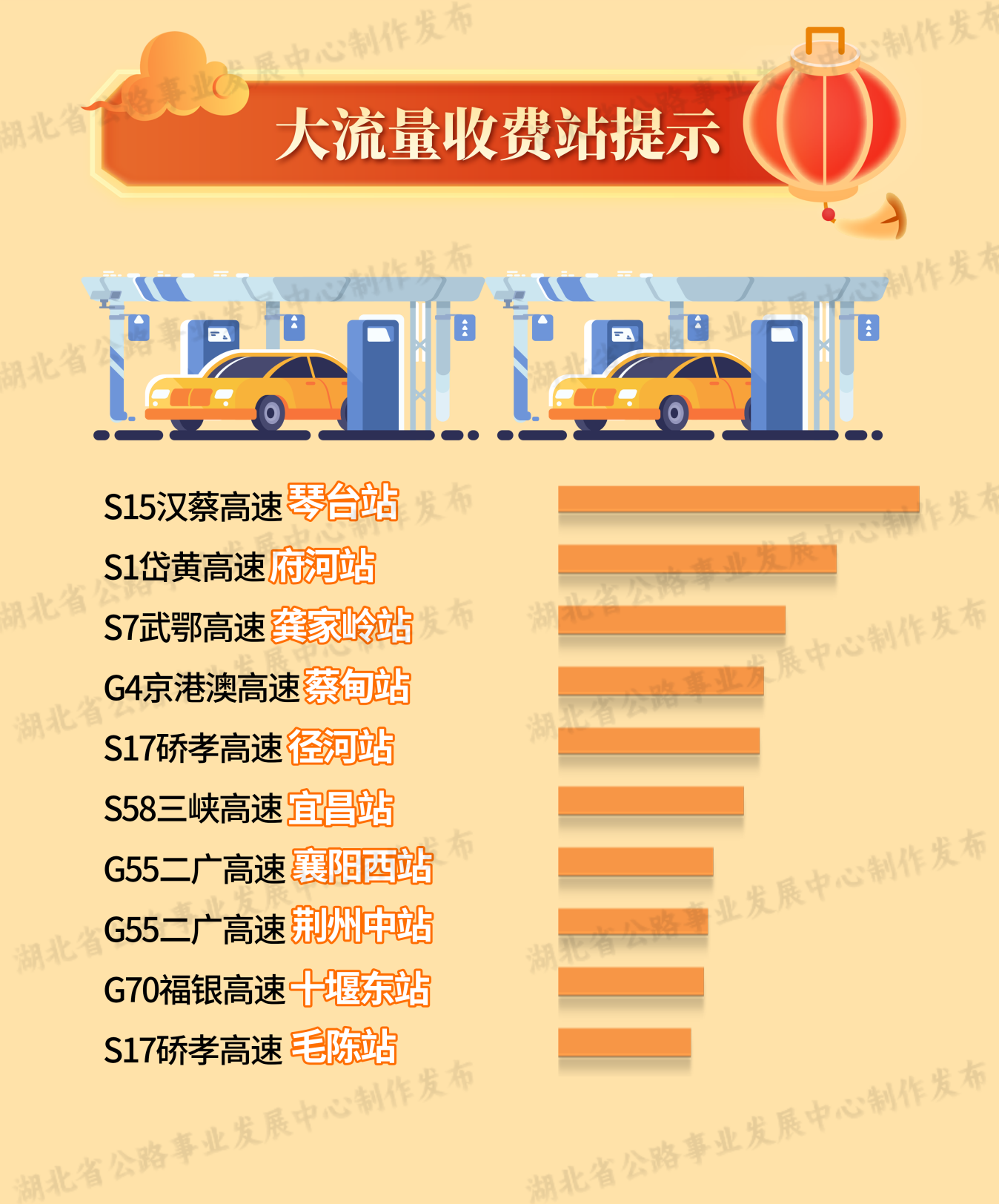 流量集中的高速公路收費(fèi)站主要有S15漢蔡高速琴臺(tái)站,S1岱黃高速府河站,S7武鄂高速龔家?guī)X站,G4京港澳高速蔡甸站,S17硚孝高速?gòu)胶诱?,S58三峽高速宜昌站,G55二廣高速襄陽(yáng)西站、荊州中站,G70福銀高速十堰東站,S17硚孝高速毛陳站。