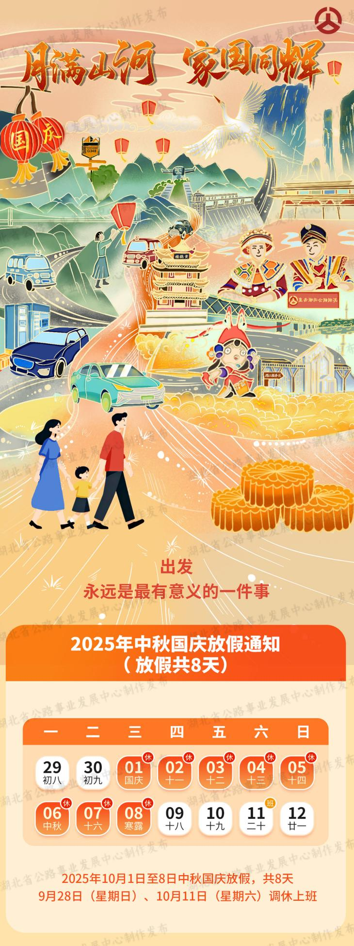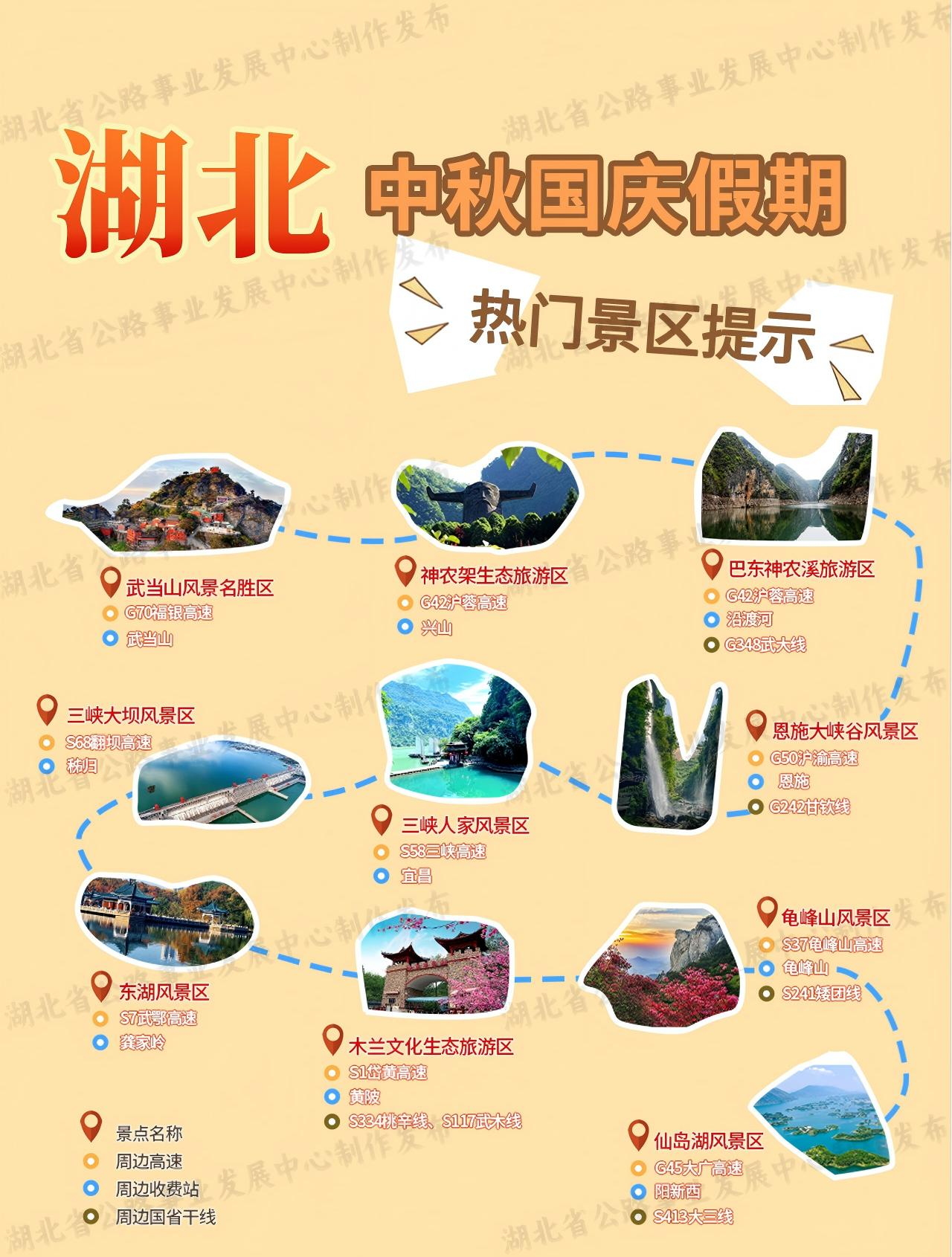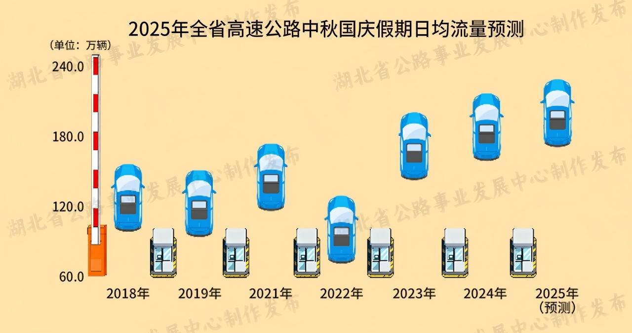 2025年中秋國(guó)慶假期即將到來(lái),放假時(shí)間為10月1日至10月8日。根據(jù)國(guó)務(wù)院發(fā)布的《關(guān)于批轉(zhuǎn)交通運(yùn)輸部等部門(mén)重大節(jié)假日免收小型客車(chē)通行費(fèi)實(shí)施方案的通知》,中秋國(guó)慶假期期間,收費(fèi)公路對(duì)7座及以下小型客車(chē)免費(fèi)通行,免費(fèi)時(shí)間段為10月1日0時(shí)至10月8日24時(shí),共計(jì)八天。湖北省公路事業(yè)發(fā)展中心根據(jù)歷年來(lái)中秋國(guó)慶假期全省公路網(wǎng)運(yùn)行監(jiān)測(cè)情況分析,預(yù)計(jì)今年中秋國(guó)慶期間路網(wǎng)流量較平日大幅增長(zhǎng),社會(huì)公眾探親訪友、度假旅游等中短途出行需求將會(huì)集中釋放,省內(nèi)各市州周邊路段和通往省內(nèi)知名景區(qū)路段的交通流量將出現(xiàn)明顯增幅,省內(nèi)國(guó)高網(wǎng)、國(guó)省干線、武漢市周邊路段易出現(xiàn)不同程度的擁堵緩行?,F(xiàn)編制《2025年中秋國(guó)慶假期湖北省干線公路出行指南》,為公眾平安便捷出行提供參考。