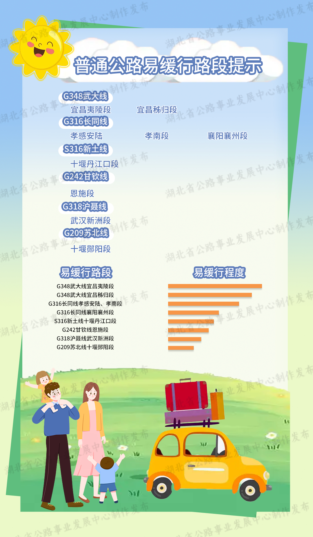 普通國(guó)省干線擁堵緩行主要集中在G348武大線宜昌夷陵段,宜昌秭歸段,G316長(zhǎng)同線孝感安陸、孝南段,襄陽(yáng)襄州段,S316新土線十堰丹江口段,G242甘欽線恩施段,G318滬聶線武漢新洲段,G209蘇北線十堰鄖陽(yáng)段。