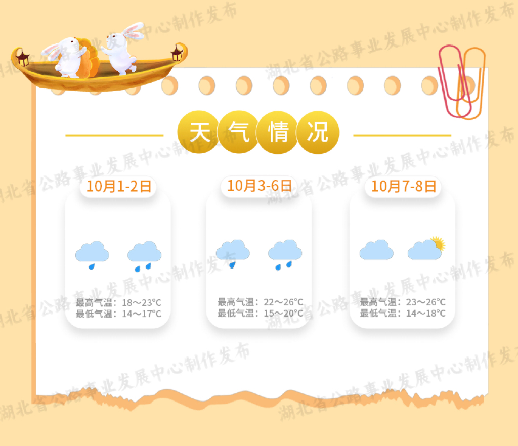 湖北省公路事業(yè)發(fā)展中心經(jīng)與省氣象服務(wù)中心會(huì)商研判,預(yù)計(jì)中秋國(guó)慶假期期間,我省多降水,氣溫有起伏。1日-2日全省有小到中雨,部分地區(qū)有大雨;3-6日全省還將有一次降水過(guò)程,省內(nèi)大部地區(qū)小到中雨;7-8日天氣轉(zhuǎn)好,大部陰天到多云,西部有小雨。具體預(yù)報(bào)如下: