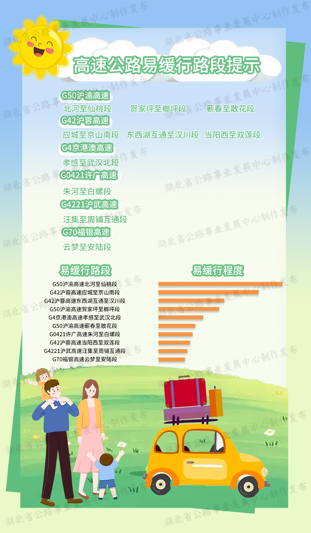 高速公路擁堵緩行主要集中在G50滬渝高速北河至仙桃段、賀家坪至榔坪段、蘄春至散花段,G42滬蓉高速應(yīng)城至京山南段、東西湖互通至漢川段、當(dāng)陽(yáng)西至雙蓮段,G4京港澳高速孝感至武漢北段,G0421許廣高速朱河至白螺段,G4221滬武高速汪集至周鋪互通段,G70福銀高速云夢(mèng)至安陸段。