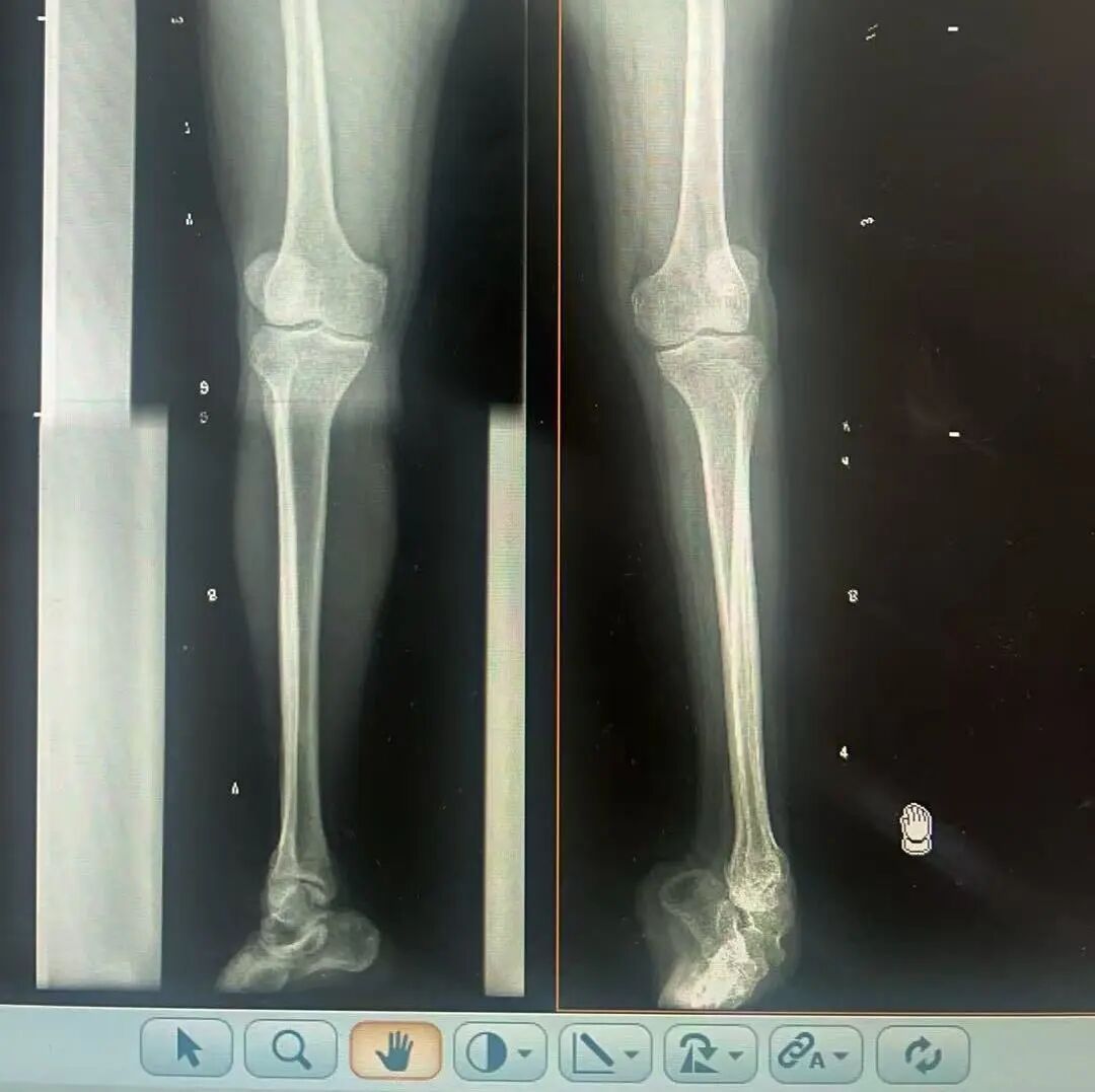 骨科隨即為陽先生進行了全面的檢查。診斷明確而復(fù)雜:陽先生患有脊髓灰質(zhì)炎后遺癥、左踝馬蹄內(nèi)翻足、骨盆傾斜……面對這張沉甸甸的診斷書,由肢體功能重建顯微修復(fù)學(xué)科組長鄭群龍所帶領(lǐng)的醫(yī)療團隊沒有畏懼,“這是一個家庭38年的堅守與期盼,我們必須全力以赴”
