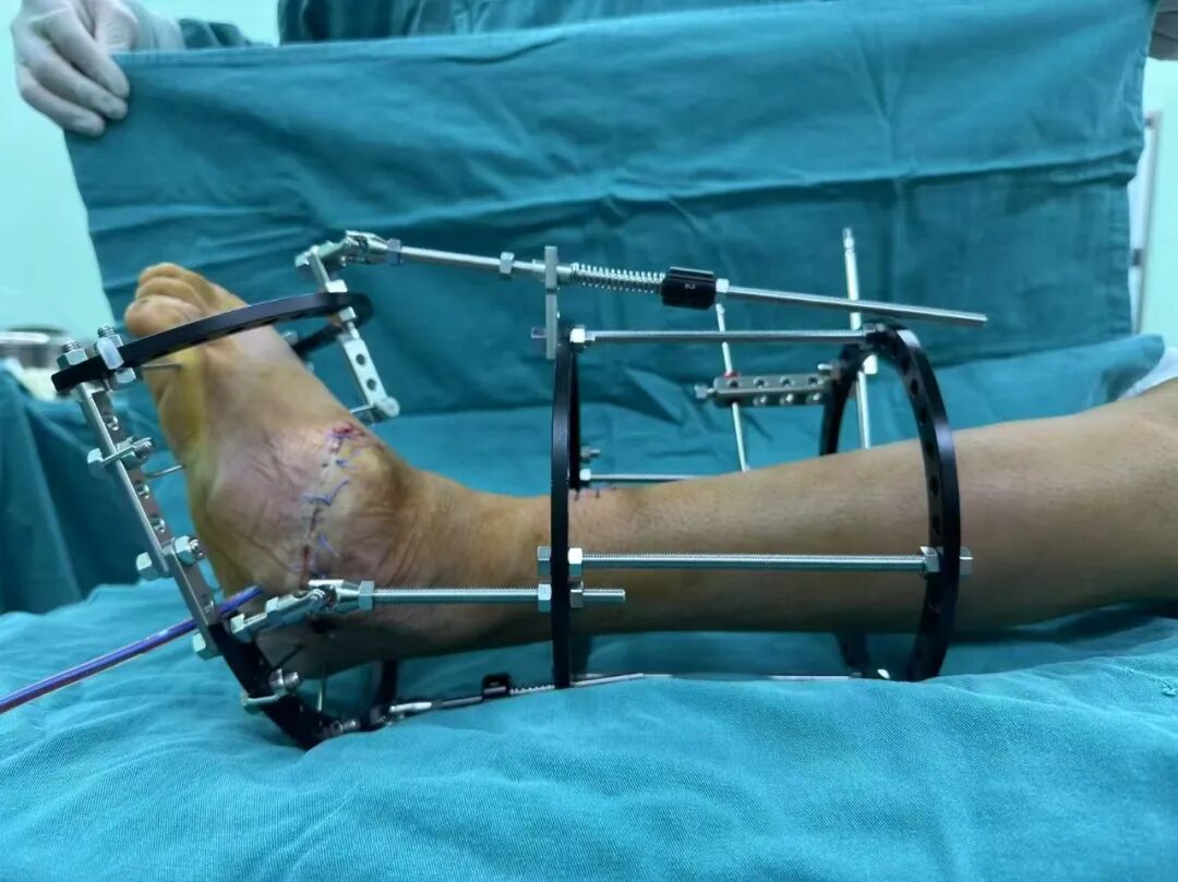 針對陽先生的復(fù)雜情況,鄭群龍醫(yī)師團隊制定了詳盡的手術(shù)方案:左踝關(guān)節(jié)融合+馬蹄足畸形矯正+跟腱延長+外固定架固定術(shù)。手術(shù)的核心,正是伊里扎洛夫技術(shù)。這項技術(shù)如同精密的“時空建筑學(xué)”,通過微創(chuàng)安裝環(huán)形外固定架,前足-后足安裝鋼環(huán),再將足的鋼環(huán)與脛骨的固定鋼環(huán)在踝關(guān)節(jié)前、后、左、右用帶關(guān)節(jié)的螺紋桿連接,由此構(gòu)建成一個能體外牽拉調(diào)控的三維立體構(gòu)型,在術(shù)后進行精準、緩慢的調(diào)整,一寸一寸逐步將畸形的骨骼、軟組織恢復(fù)到正常位置。