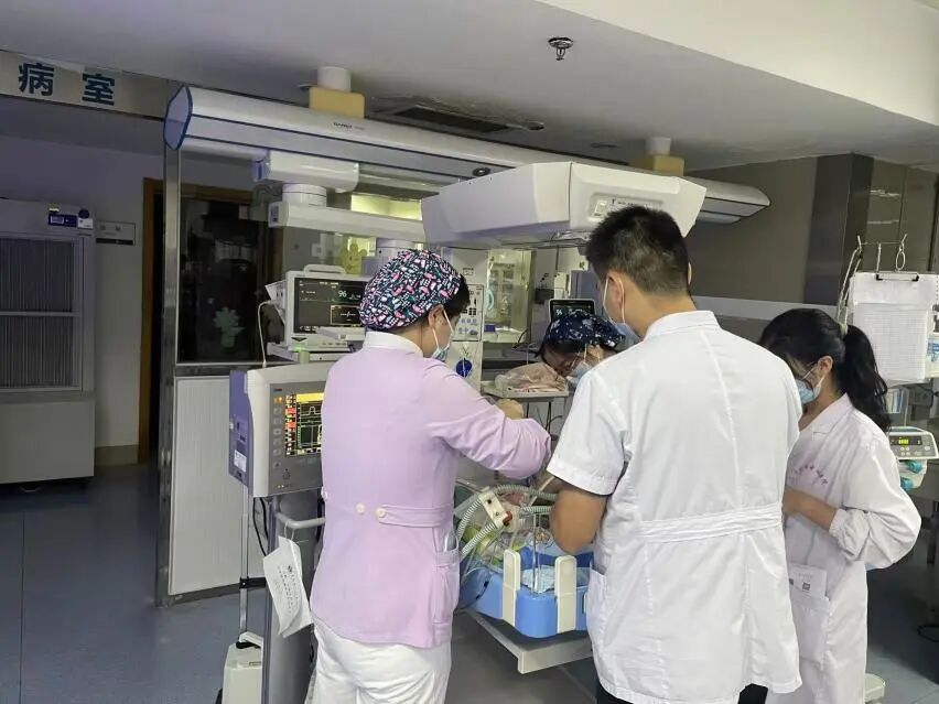 與此同時(shí),在救護(hù)車返回本院前,新生兒科病房已做好全面準(zhǔn)備:呼吸機(jī)、復(fù)蘇設(shè)備、嬰兒輻射保暖臺(tái)及B超設(shè)備等一應(yīng)俱全。患兒一經(jīng)送達(dá),便通過綠色通道直接接入新生兒重癥監(jiān)護(hù)室(NICU),醫(yī)療團(tuán)隊(duì)迅速展開一系列搶救措施:機(jī)械通氣、補(bǔ)液、抗感染治療,并完成床邊X光、肺臟彩超、顱腦及心臟彩超等周密檢查。團(tuán)隊(duì)依據(jù)檢查結(jié)果精準(zhǔn)制定治療方案,細(xì)致落實(shí)護(hù)理措施,為危重新生兒提供全方位、高水平的醫(yī)療支持。