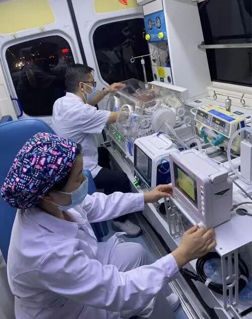 轉(zhuǎn)運(yùn)團(tuán)隊(duì)由一名新生兒科副主任醫(yī)師、一名新生兒科主管護(hù)師、一名急診科主管護(hù)師和一名資深司機(jī)組成。在短短十分鐘內(nèi),團(tuán)隊(duì)迅速集結(jié)完畢,并配備了齊全的“移動(dòng)ICU”設(shè)備,包括新生兒轉(zhuǎn)運(yùn)暖箱、便攜式呼吸機(jī)、多參數(shù)監(jiān)護(hù)儀、輸液泵及急救藥品等。其中,新生兒轉(zhuǎn)運(yùn)暖箱堪稱寶寶途中的“生命堡壘”,其恒溫、恒濕、防震設(shè)計(jì),能夠全面應(yīng)對路途中的各種挑戰(zhàn),為患兒提供最安全的保護(hù)。