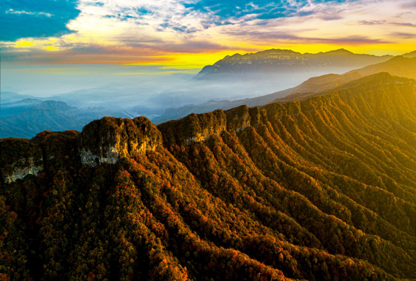 光明璀璨,霧象萬千。光霧山,地處中國南北氣候分界線,獨特的地理位置和復雜多變的山地氣候,孕育了極其豐富的植物群落。每當深秋時節(jié),寒意浸染,以巴山水青岡、槭樹、黃櫨等為主的680平方公里彩林,便奏起了生命的華彩樂章。色彩從山頂向山谷層層浸染,緋紅、橙紅、霞紅、金紅、絳紫……各種紅色交織疊加,如巨幅油畫,似流霞滿天,其面積之廣闊、色彩之斑斕、層次之分明、觀賞期之綿長,構成了“亞洲最長紅地毯”的驚世之美,堪稱自然造物的奇跡。