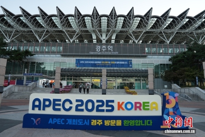 當(dāng)?shù)貢r(shí)間10月27日,韓國(guó)慶州火車站前的亞太經(jīng)合組織(APEC)標(biāo)識(shí)。中新社記者 劉旭 攝